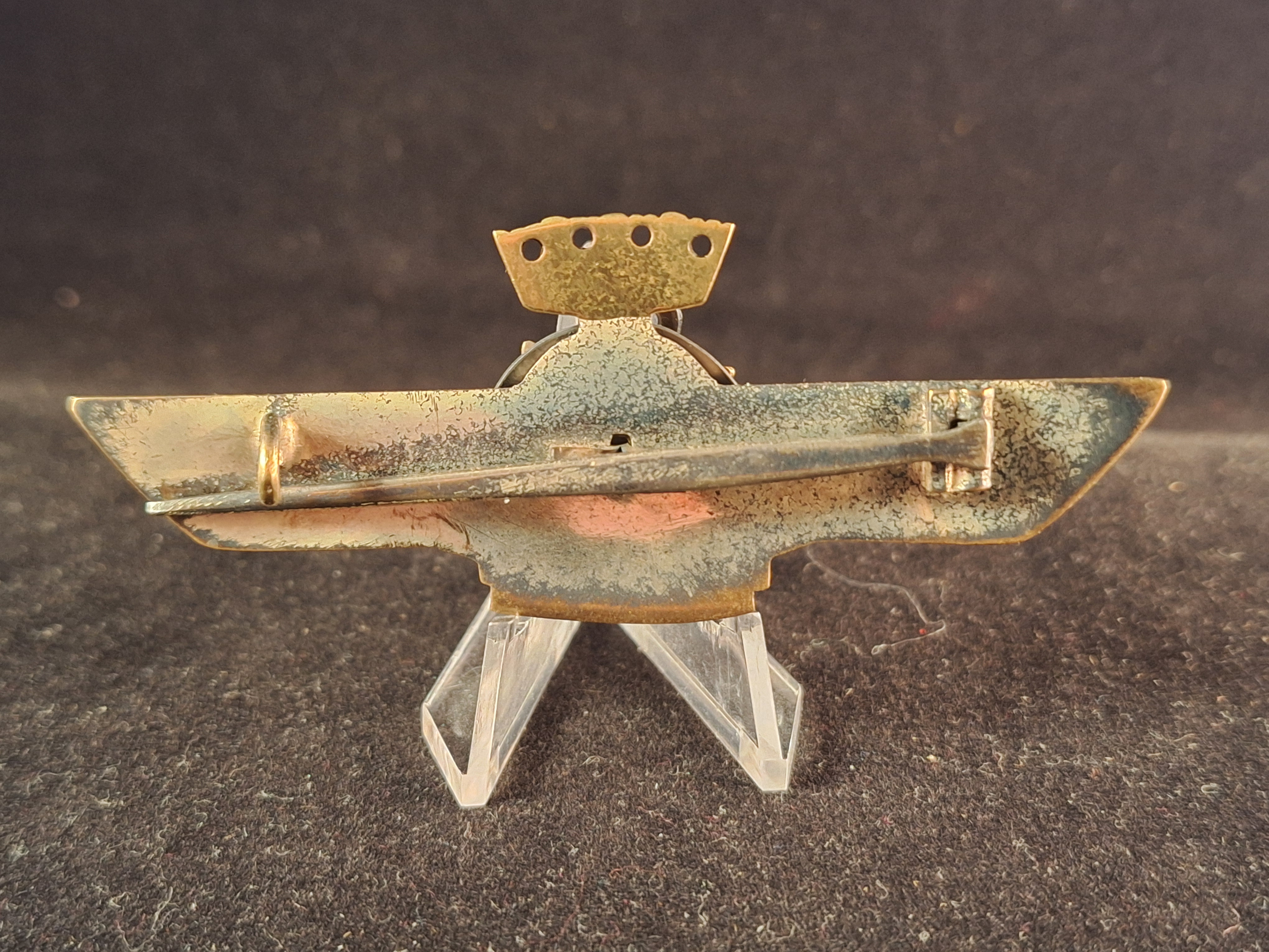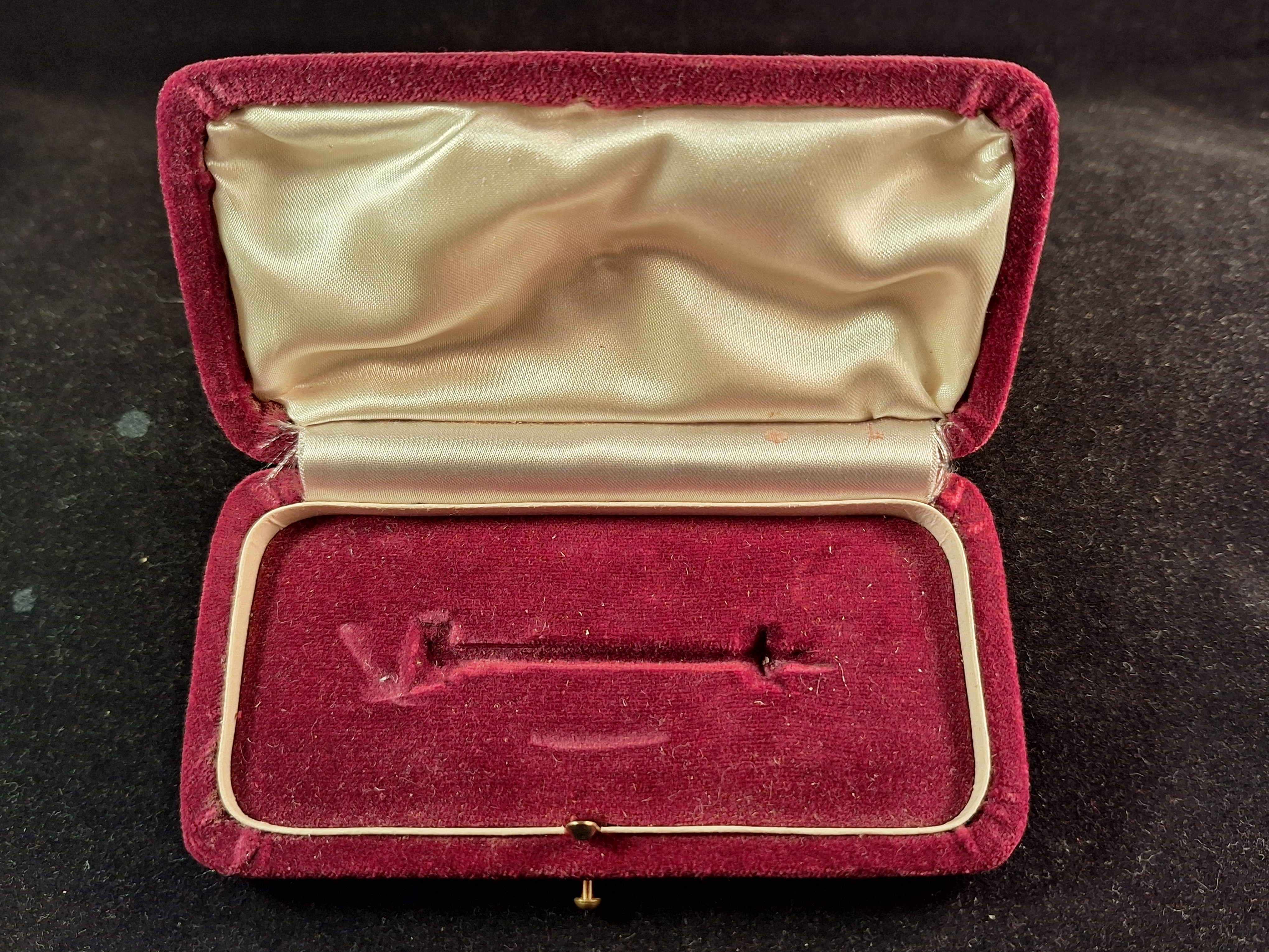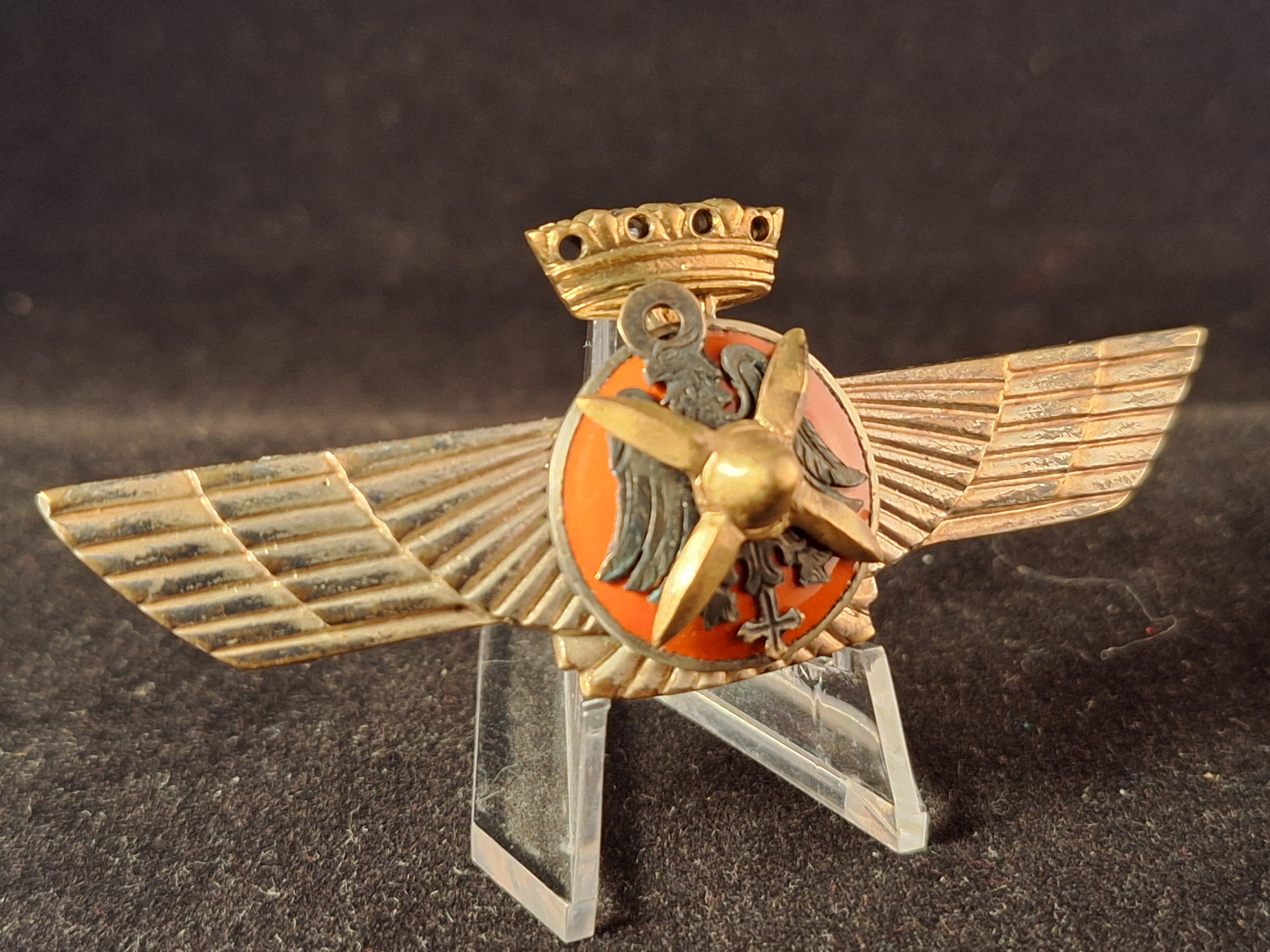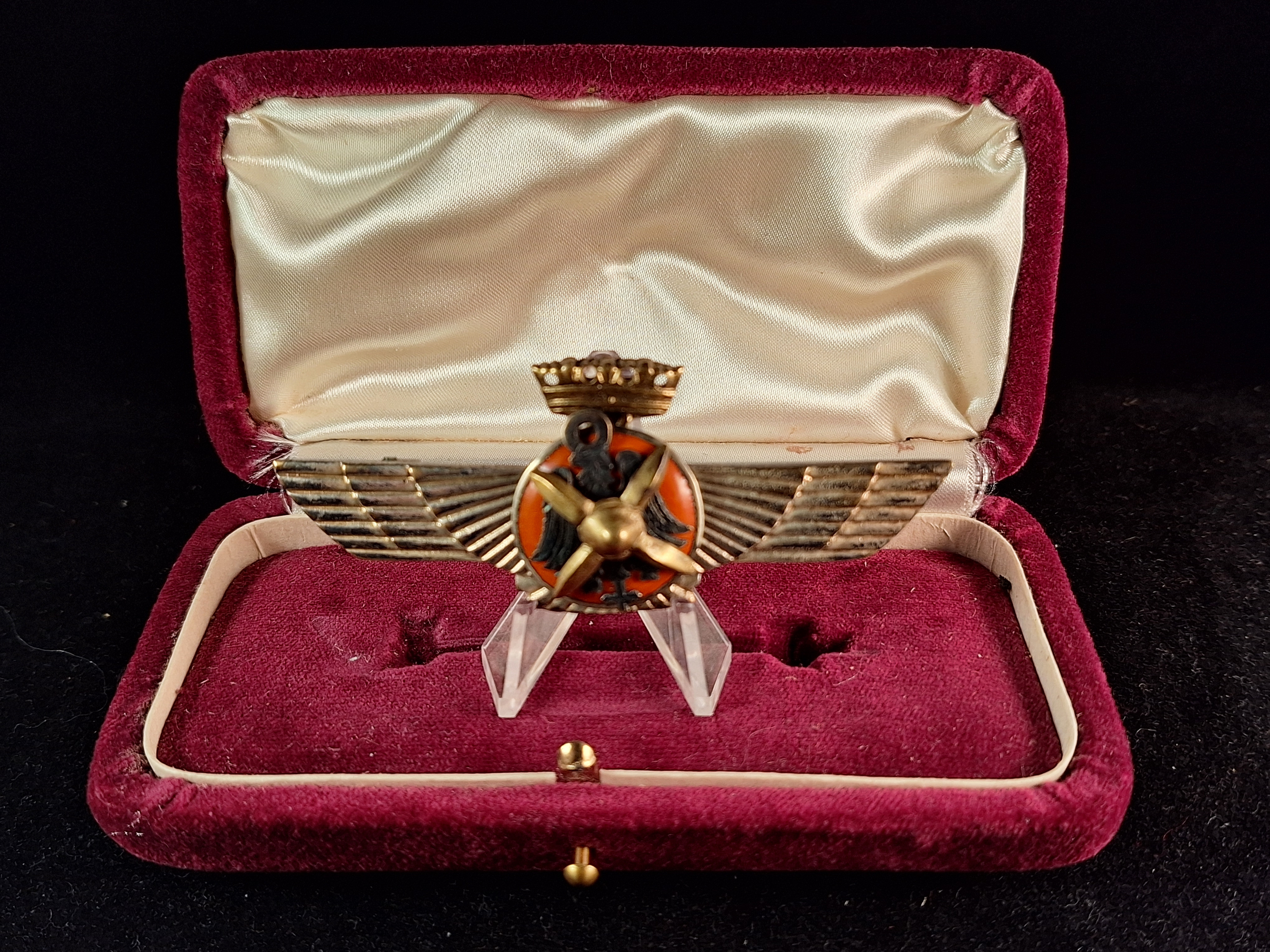 A pair of wings in silver bronze with a circular center enameled in red, on it a black brass eagle and a golden brass propeller with Imperial Crown in gold. Reverse flat. Unmarked Meybauer. Weight: 24'77grs. Dimension: 82x32mm. Case of issue in red velvet made with working opening button. Interior in red velvet with grooves to acommodate the badge. Very hard to find. *Not "make an offer" allowed.