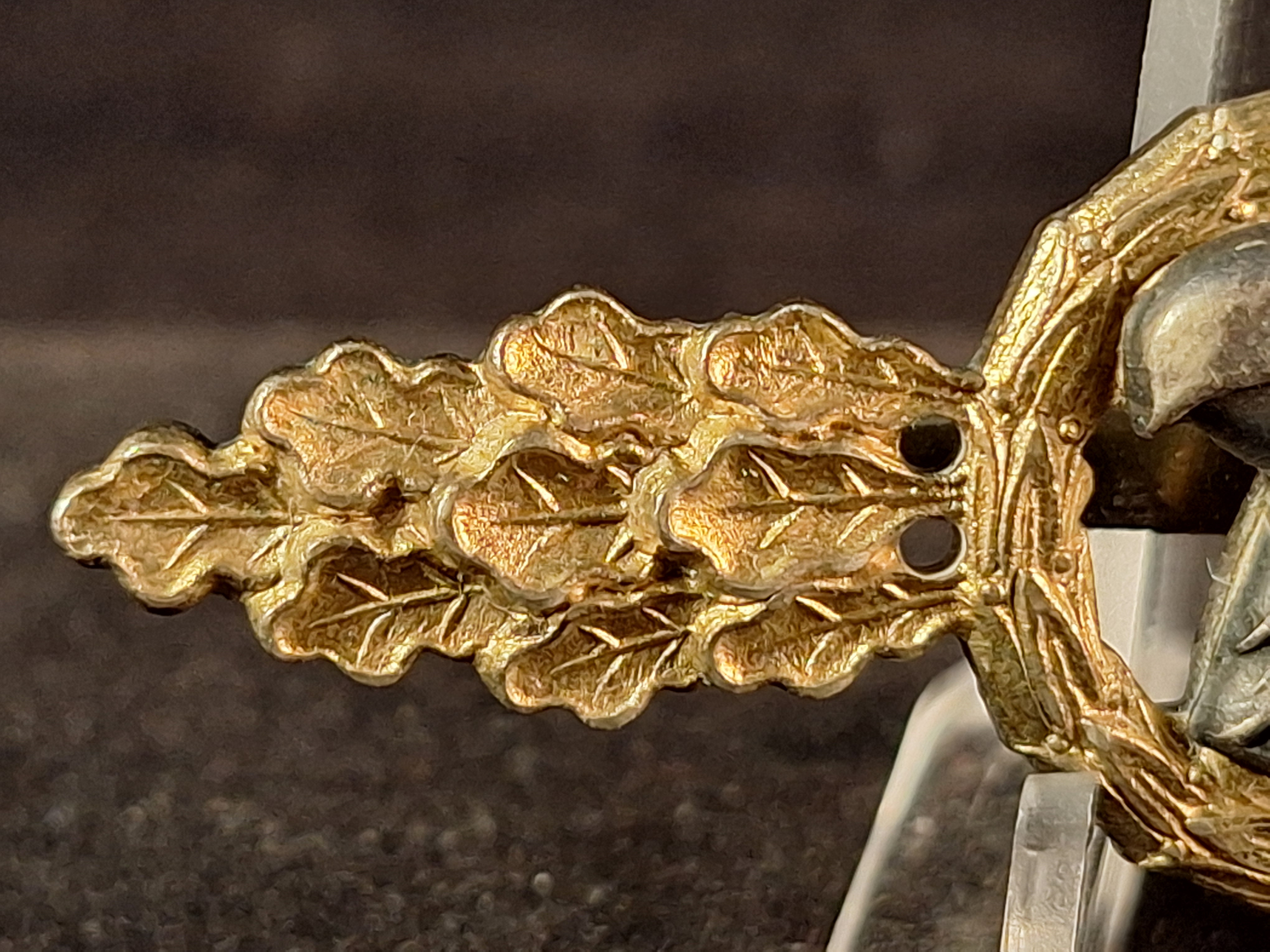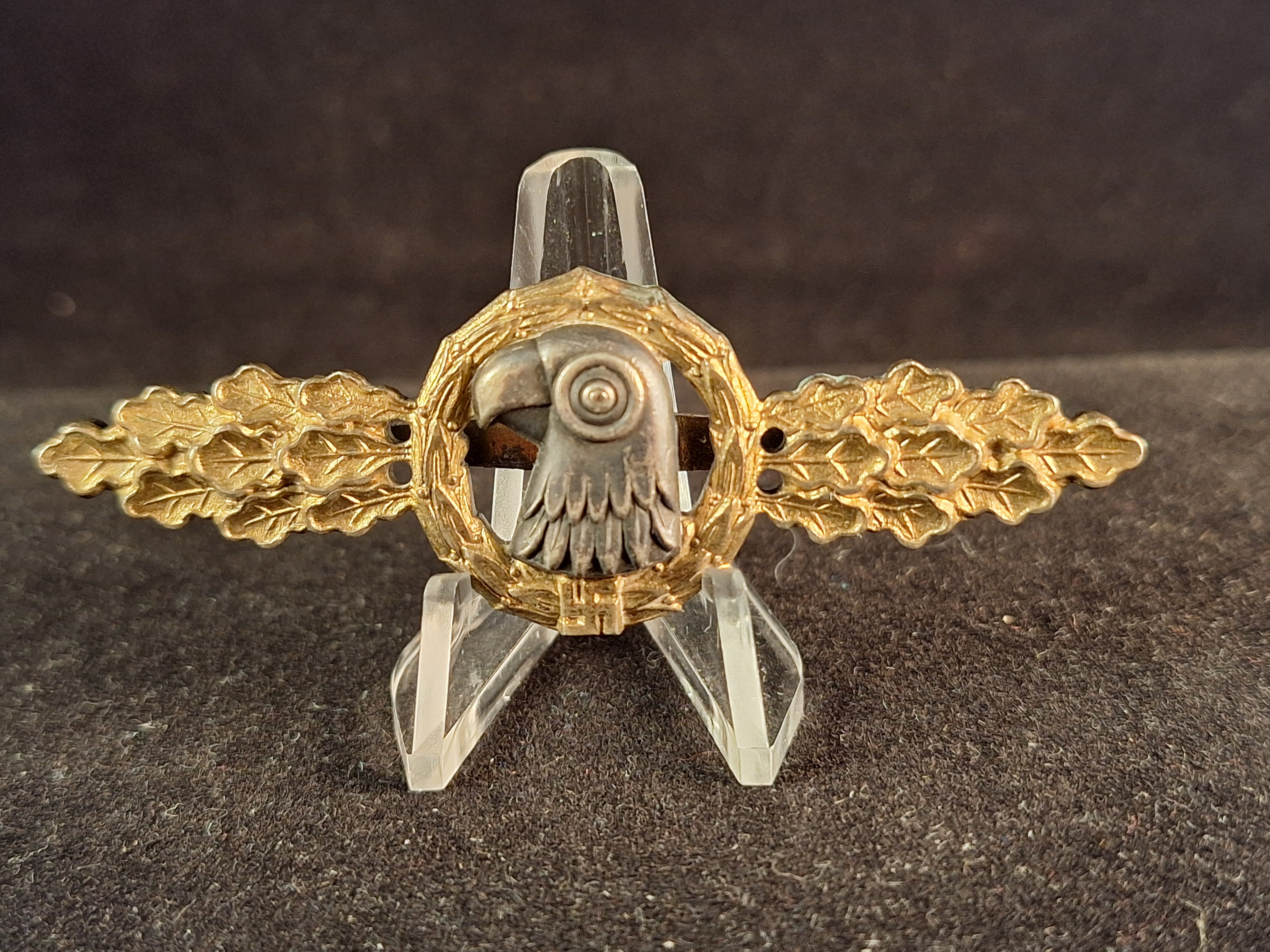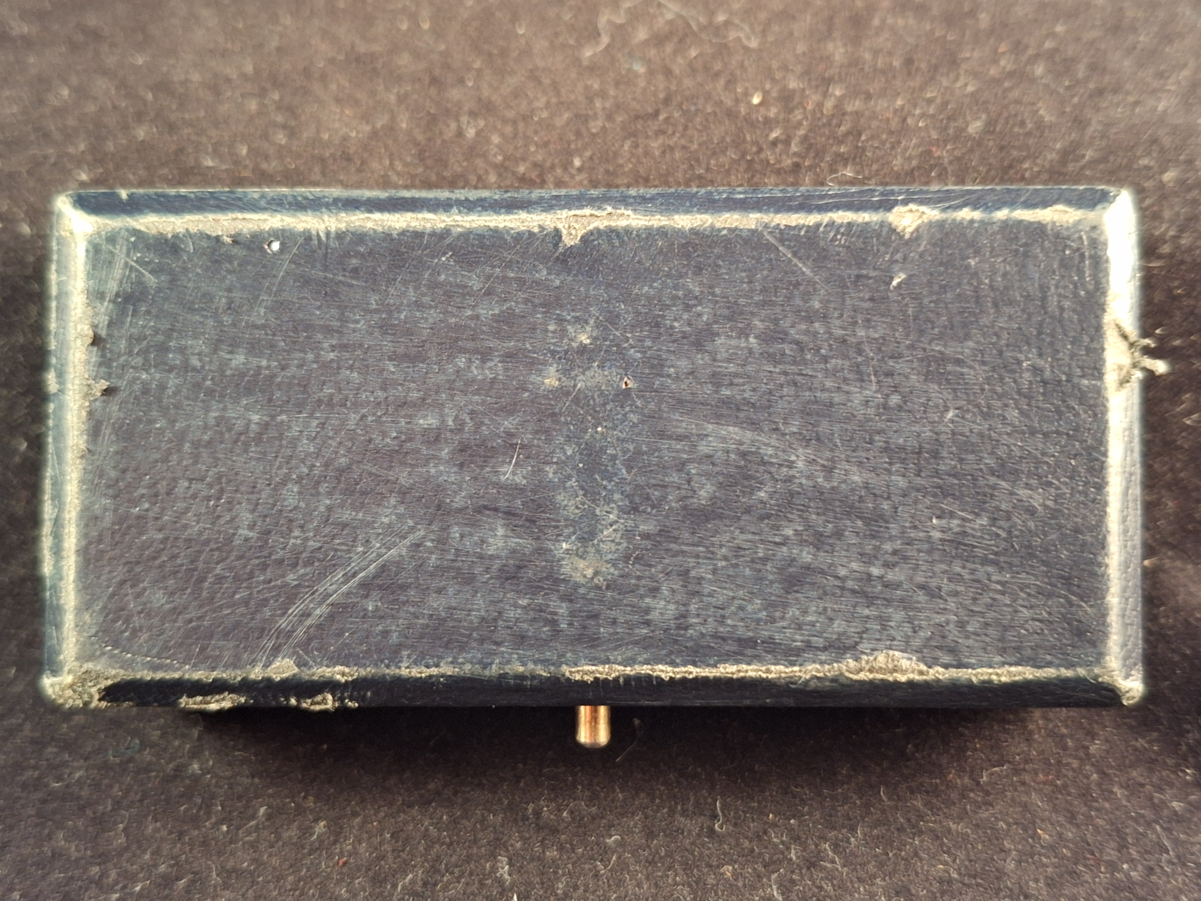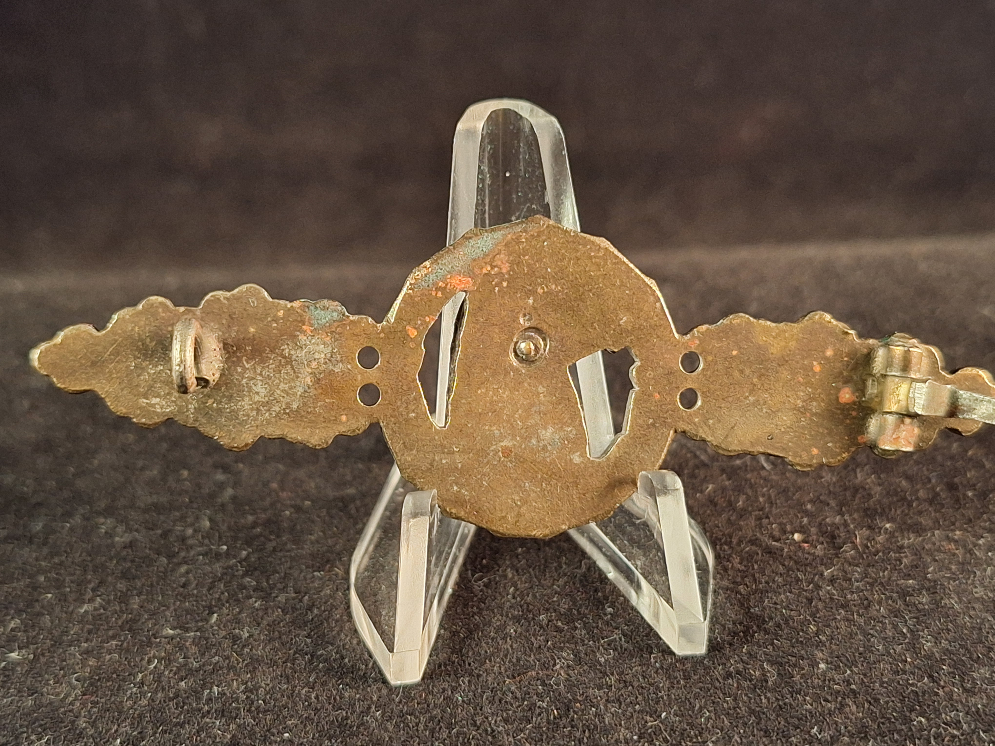 Luftwaffe reconnaisance clasp in gold. Eagle in blackened tombac. Wreath and oaks in gold. Very good condition (near mint). Unmarked C.E.Juncker. Weight: 23'27grs. Dimension: 76'5mm x 22'5mm. Case of issue in pressed cardboard dark blue. Push button magnetic; working well. Showing age and wear. Interior with whyte rayon lid and gild inscription on the lid. *Not "make an offer" allowed.