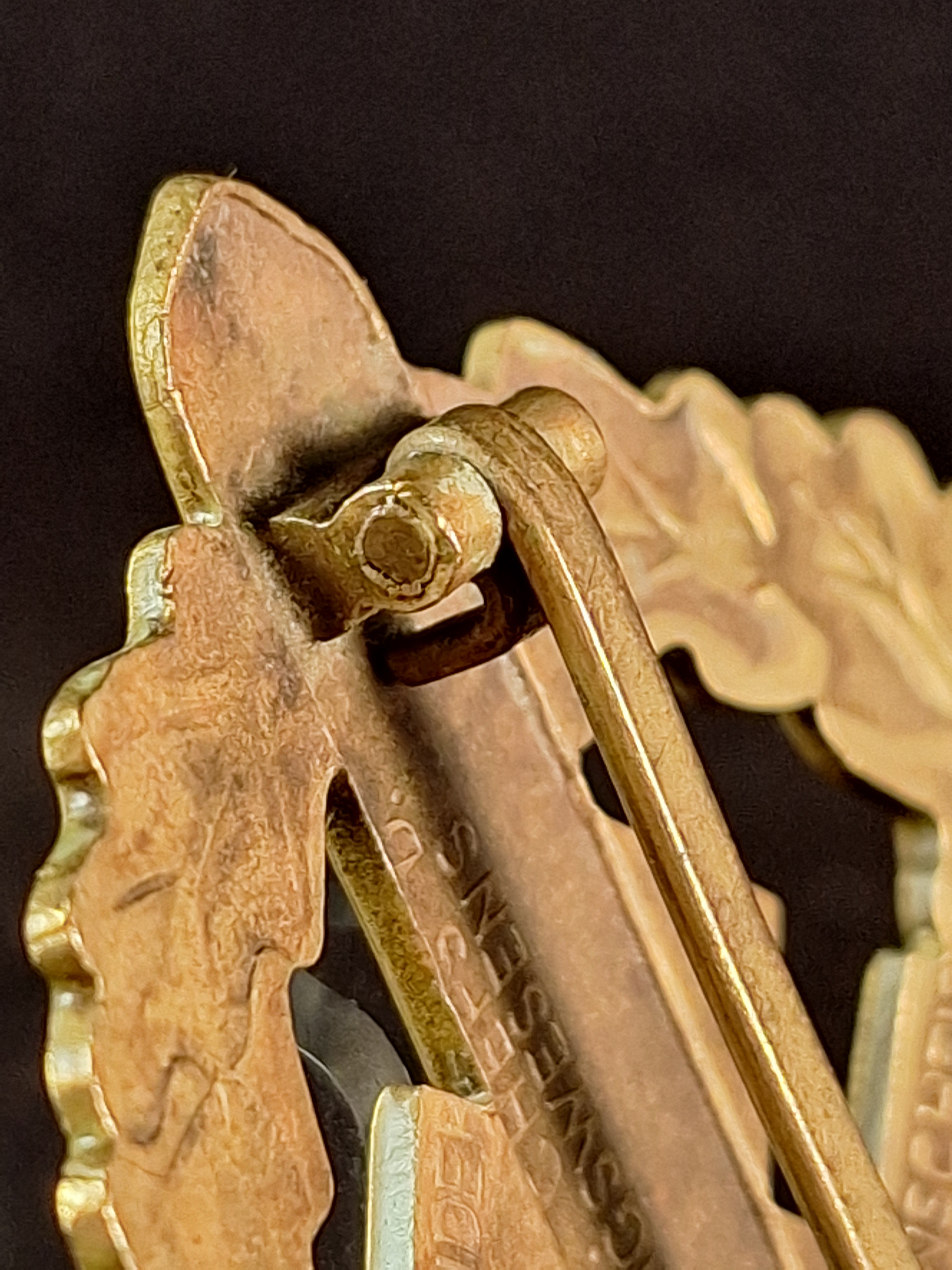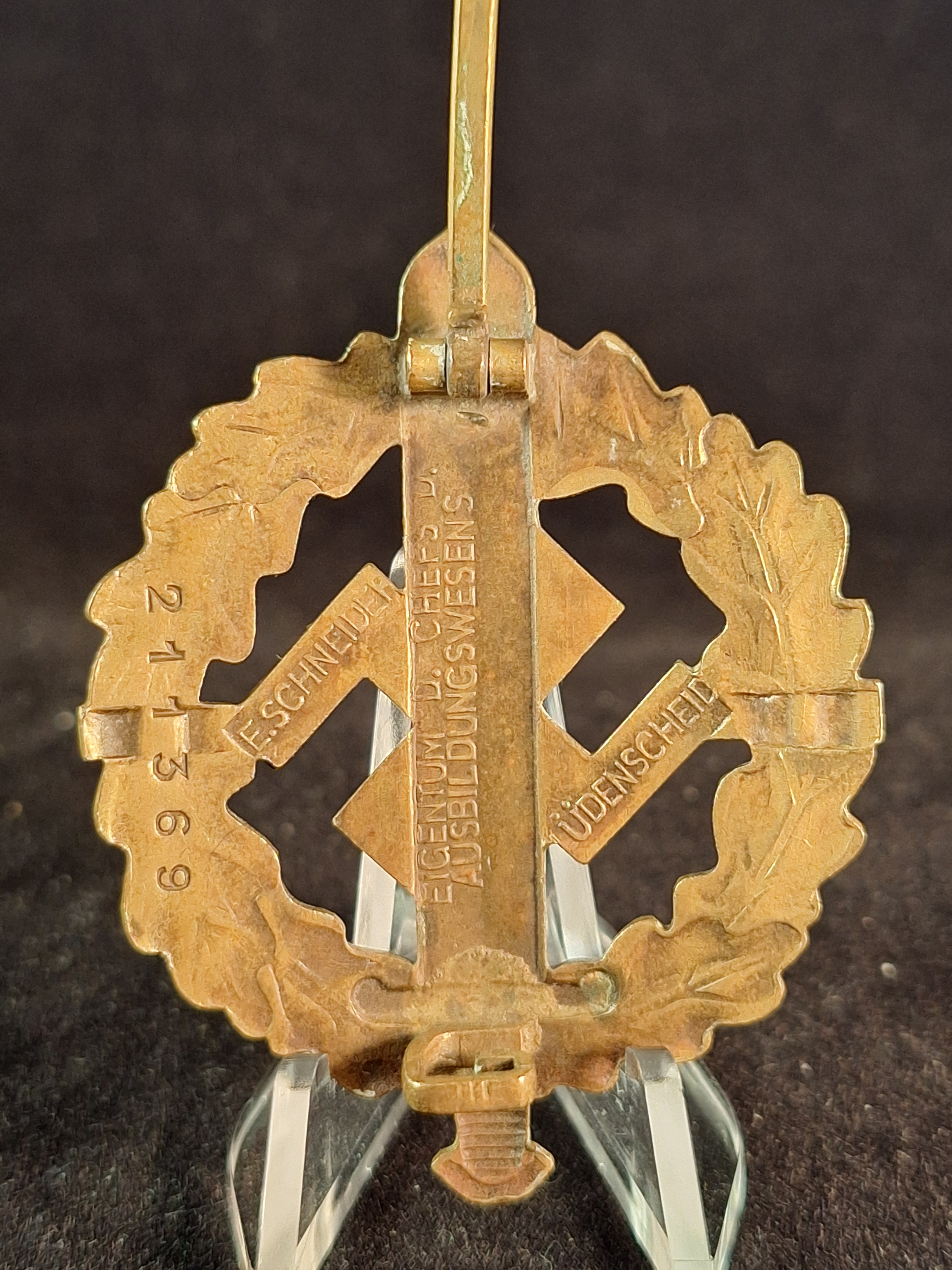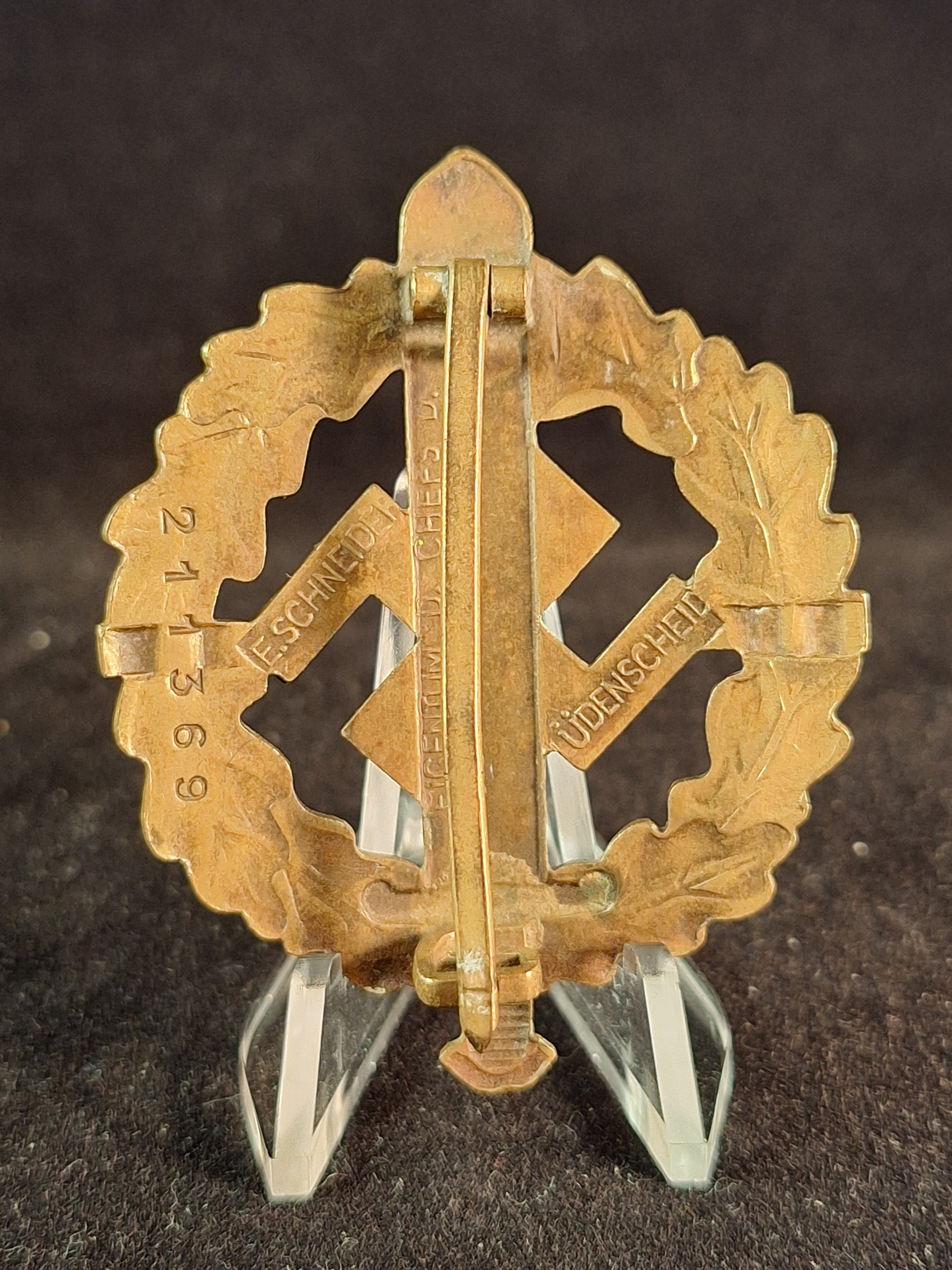 SA Sport Badge in Gold. Type 1. Gilded bronze. Non magnetic. Maker marked "E.SCHNEIDER" "EIGENTUM D. CHEFS D. AUSBILDUNGSWESENS" "LüDENSCHEID". Numbered "211369". Very good conditinon (mint). Weight: 18'11 grs. Dimension: 57mm x 45'5mm.