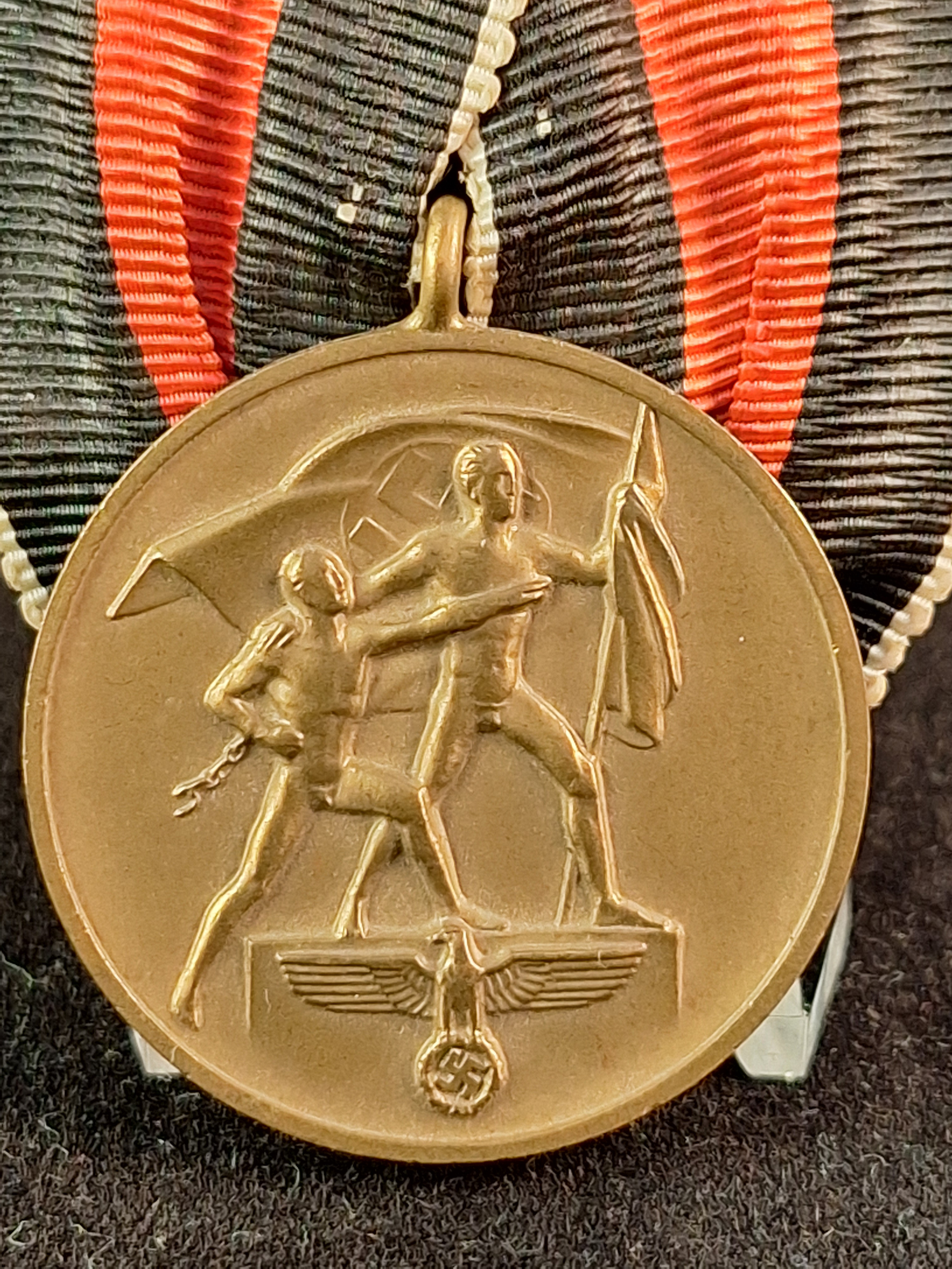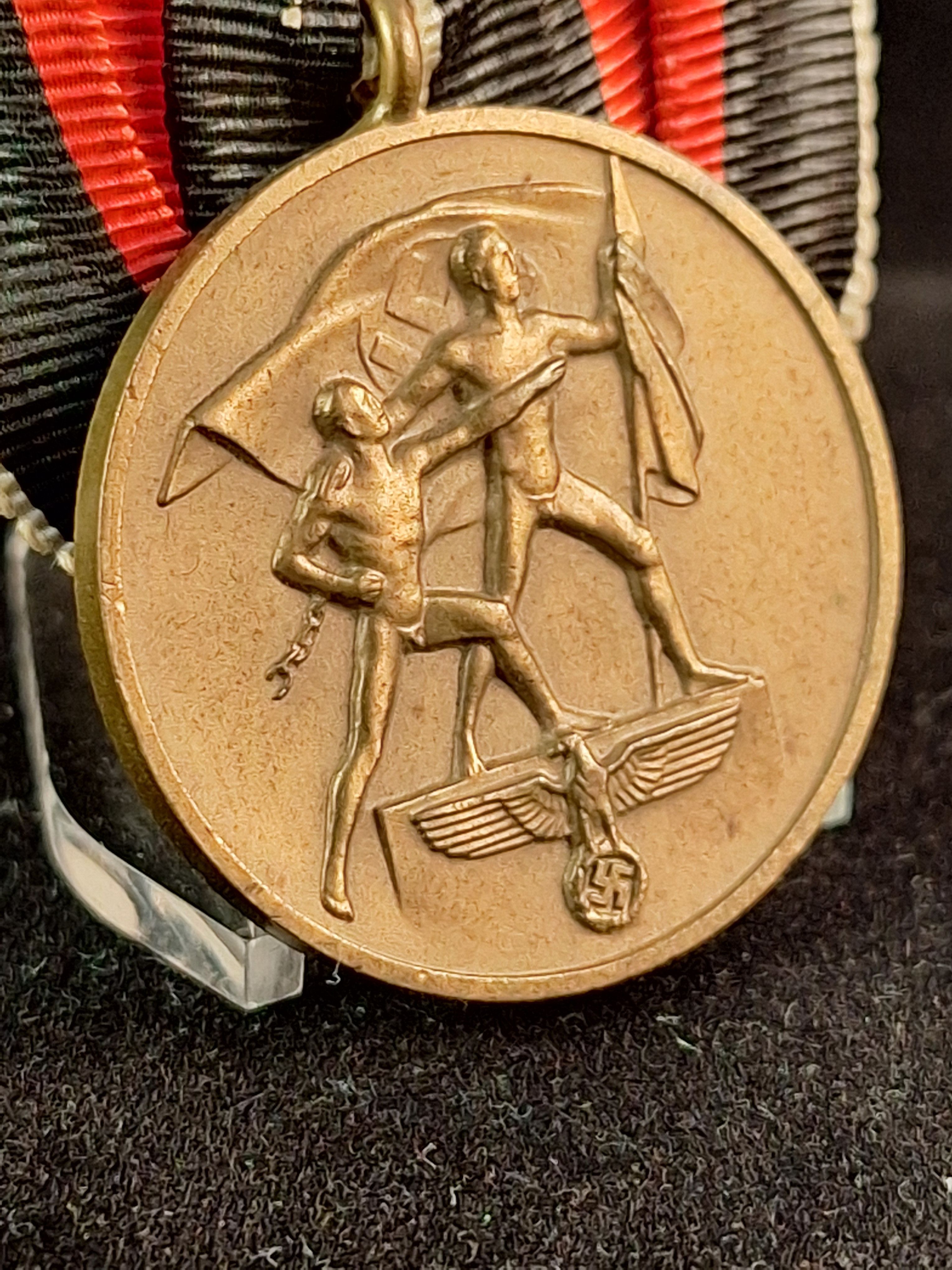 Gala medal bar with one decoration: 1) Commemorative Medal 1 Okt. 1938 (Sudetenland). Non magnetic. Bronze. Original ribbon mounted in a "gala medal" style. Unmarked (not visible). Very good condition. *Not "make an offer" allowed. Diameter: 32'5mm.