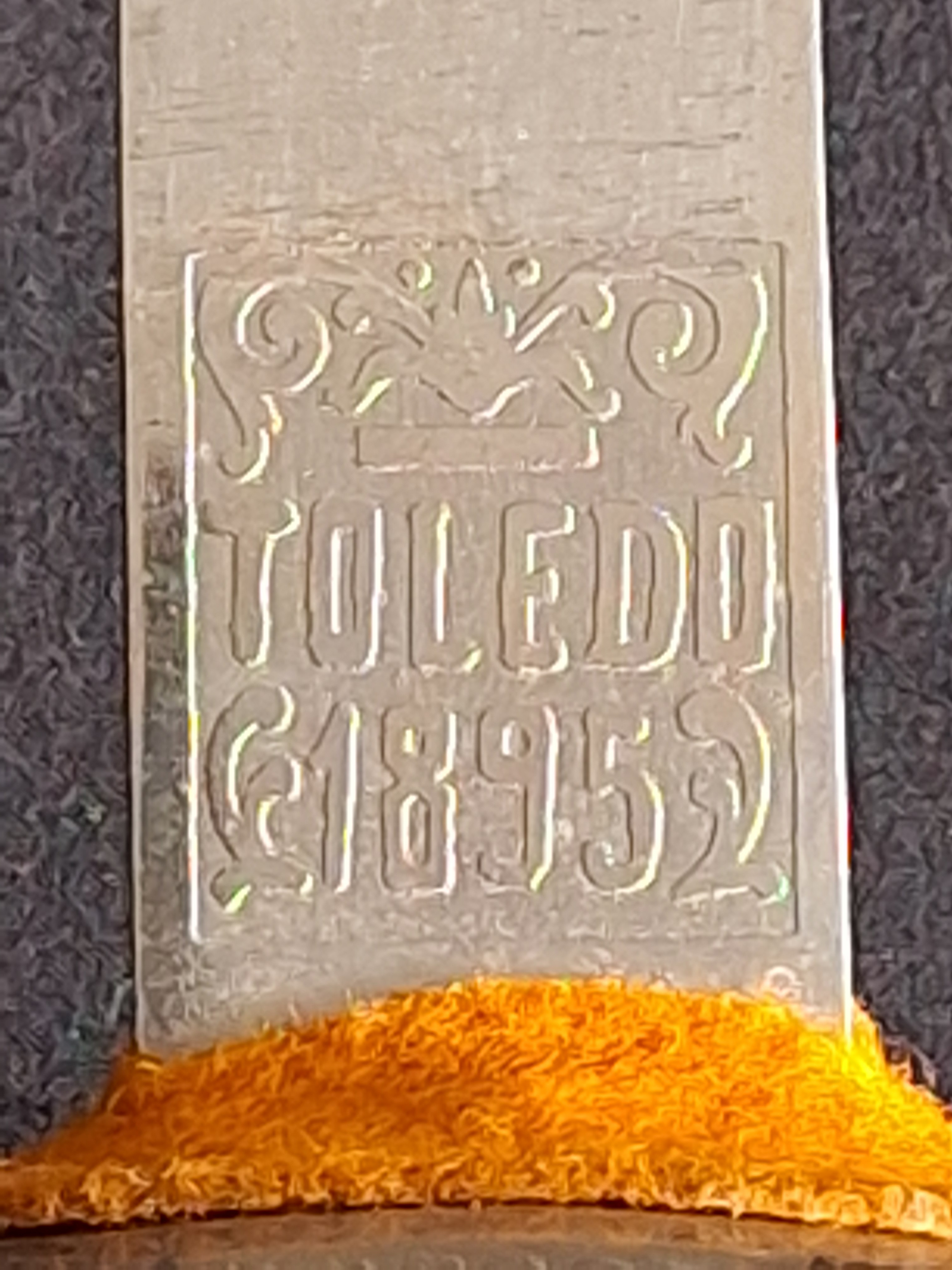 Knuckle guard and sweepings in steel. Eyelet for the pommel on top. Crossbar turned to the back. Guard with the Cavalry Shield engraved. Wooden handle held by two pins/barrette. Ricasso with inscription "Toldeo 1895". Curved and chromed blade. Crom iron scabbart. Total long: 99'5 cms.