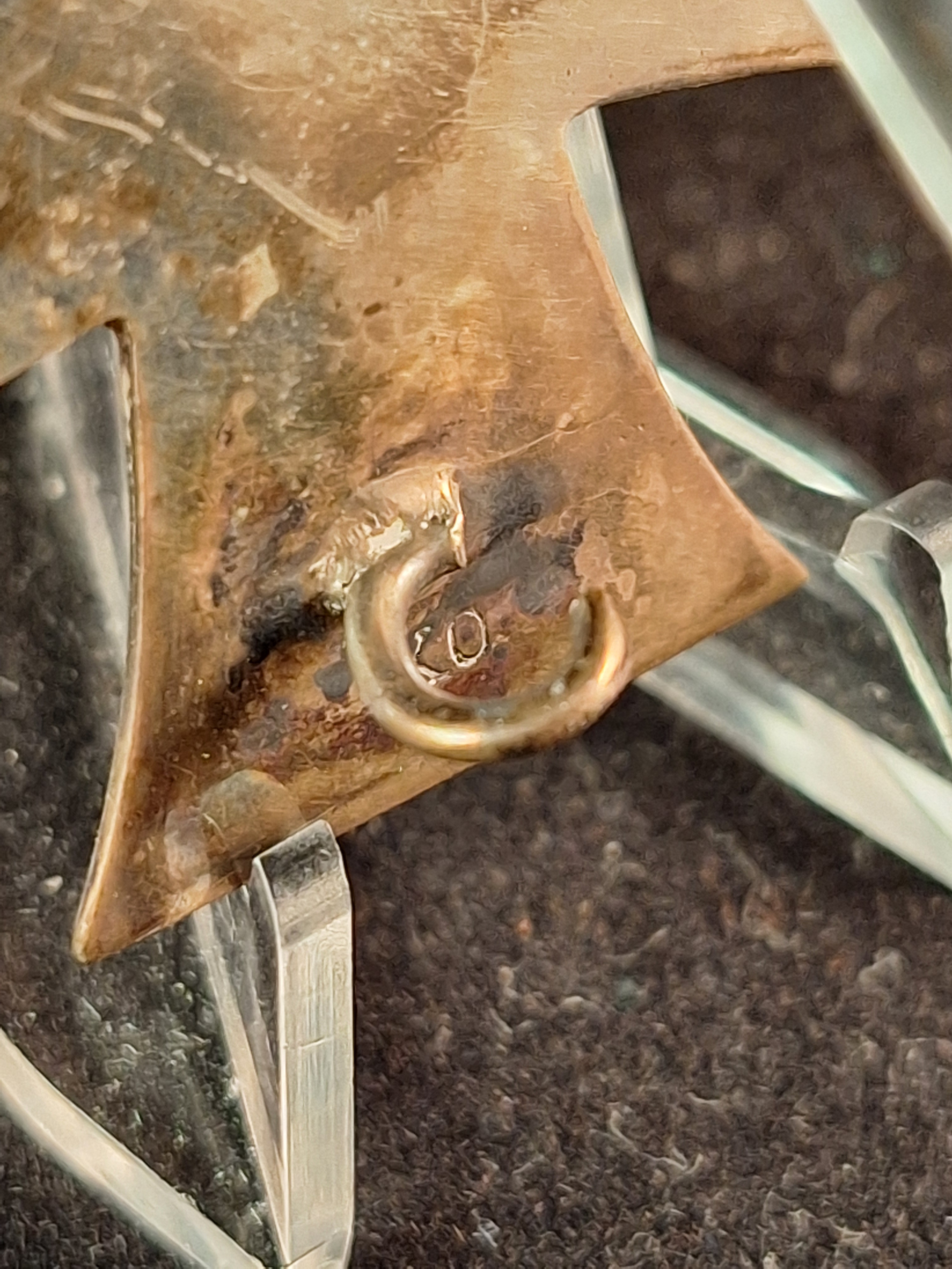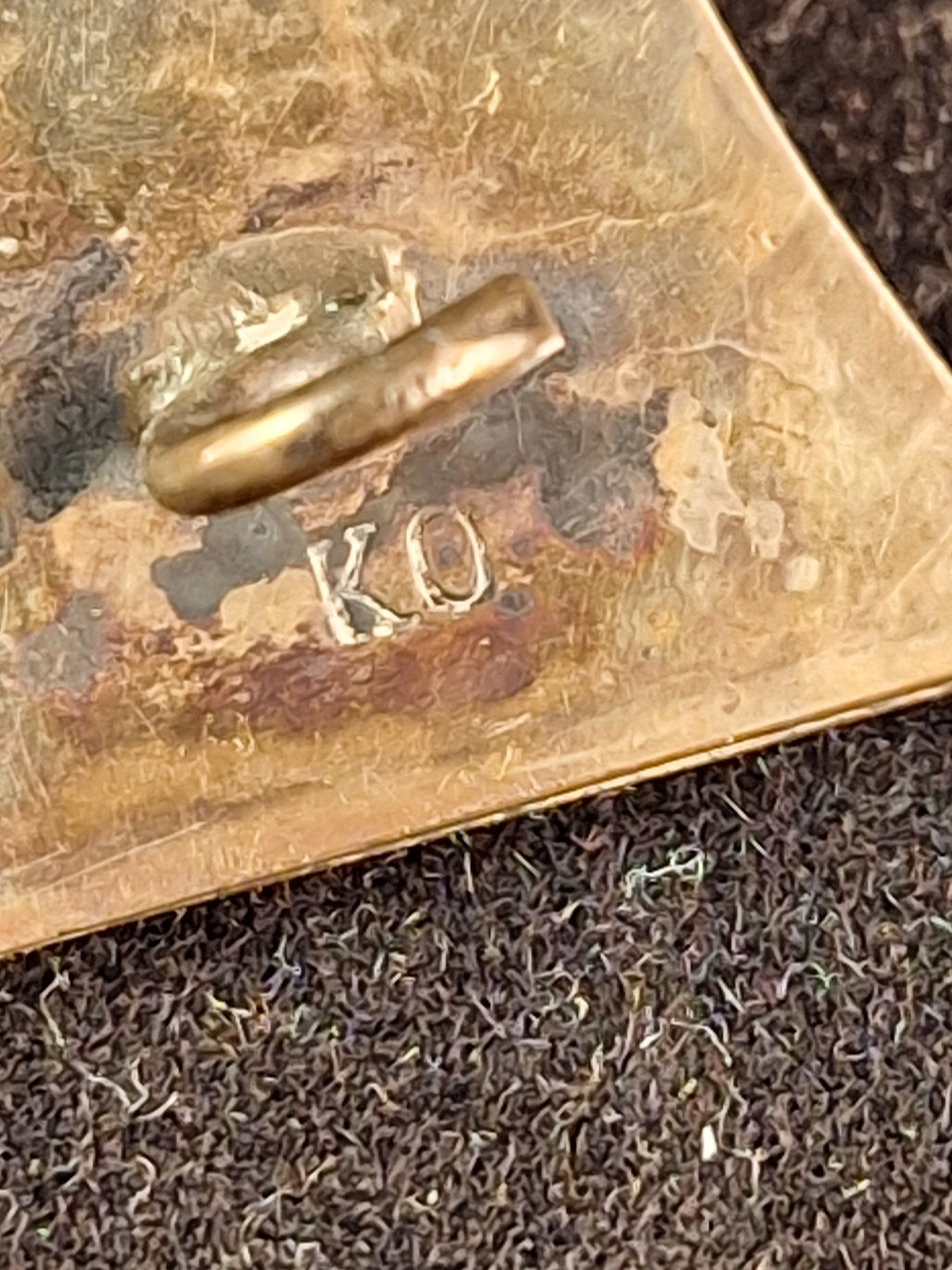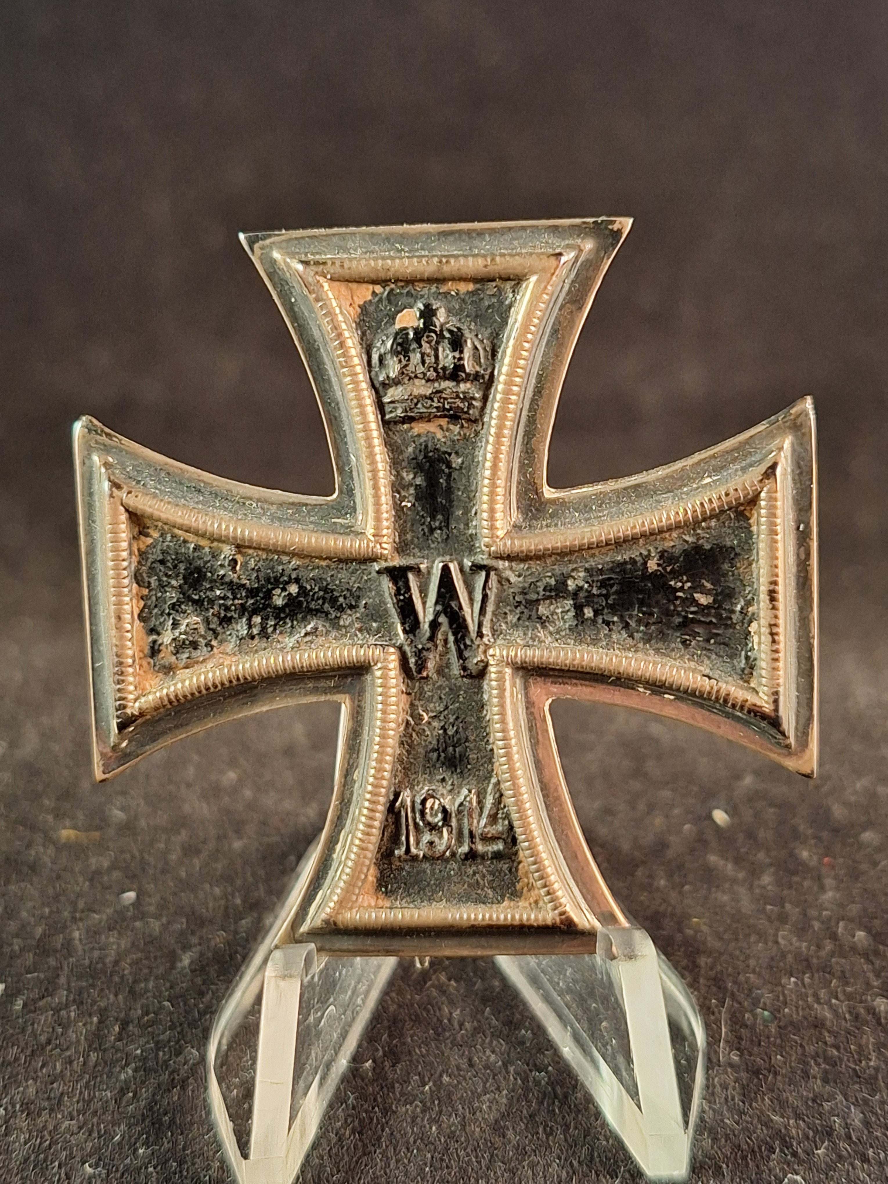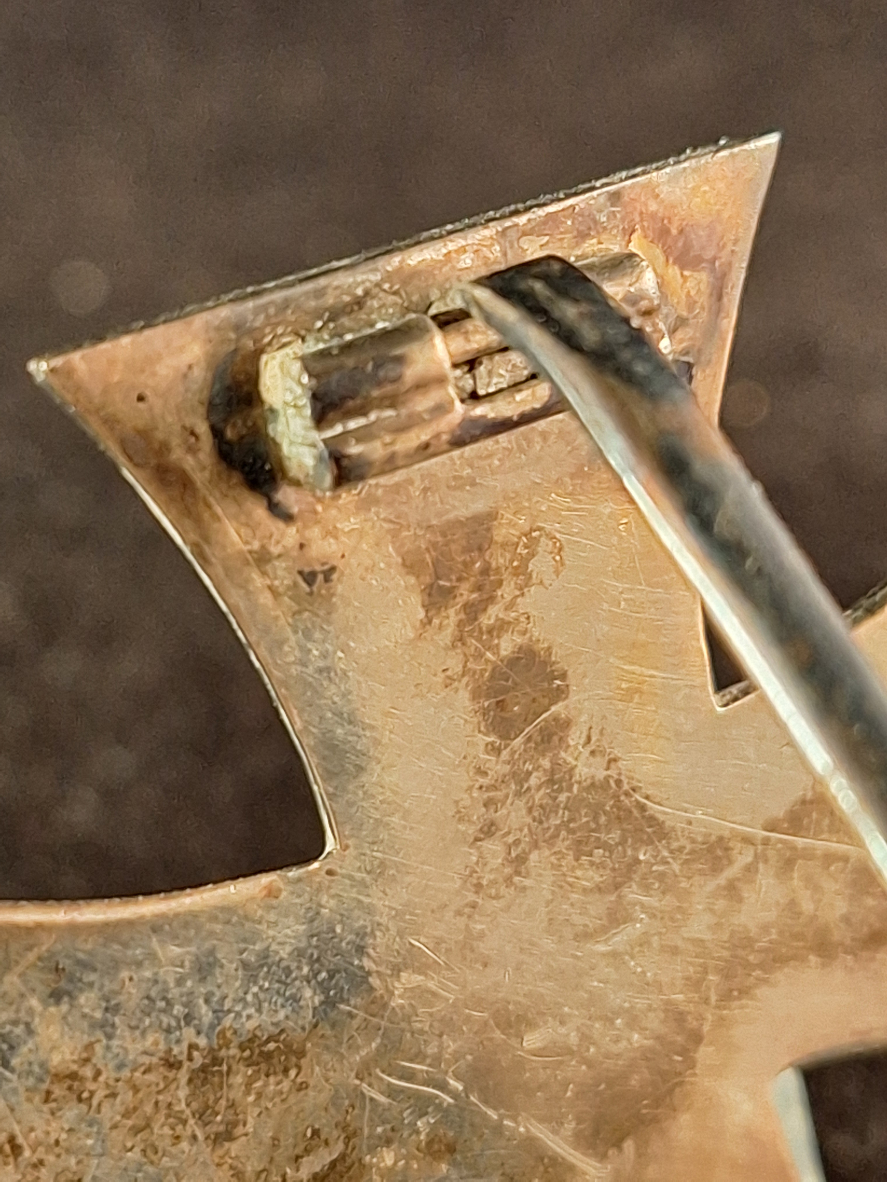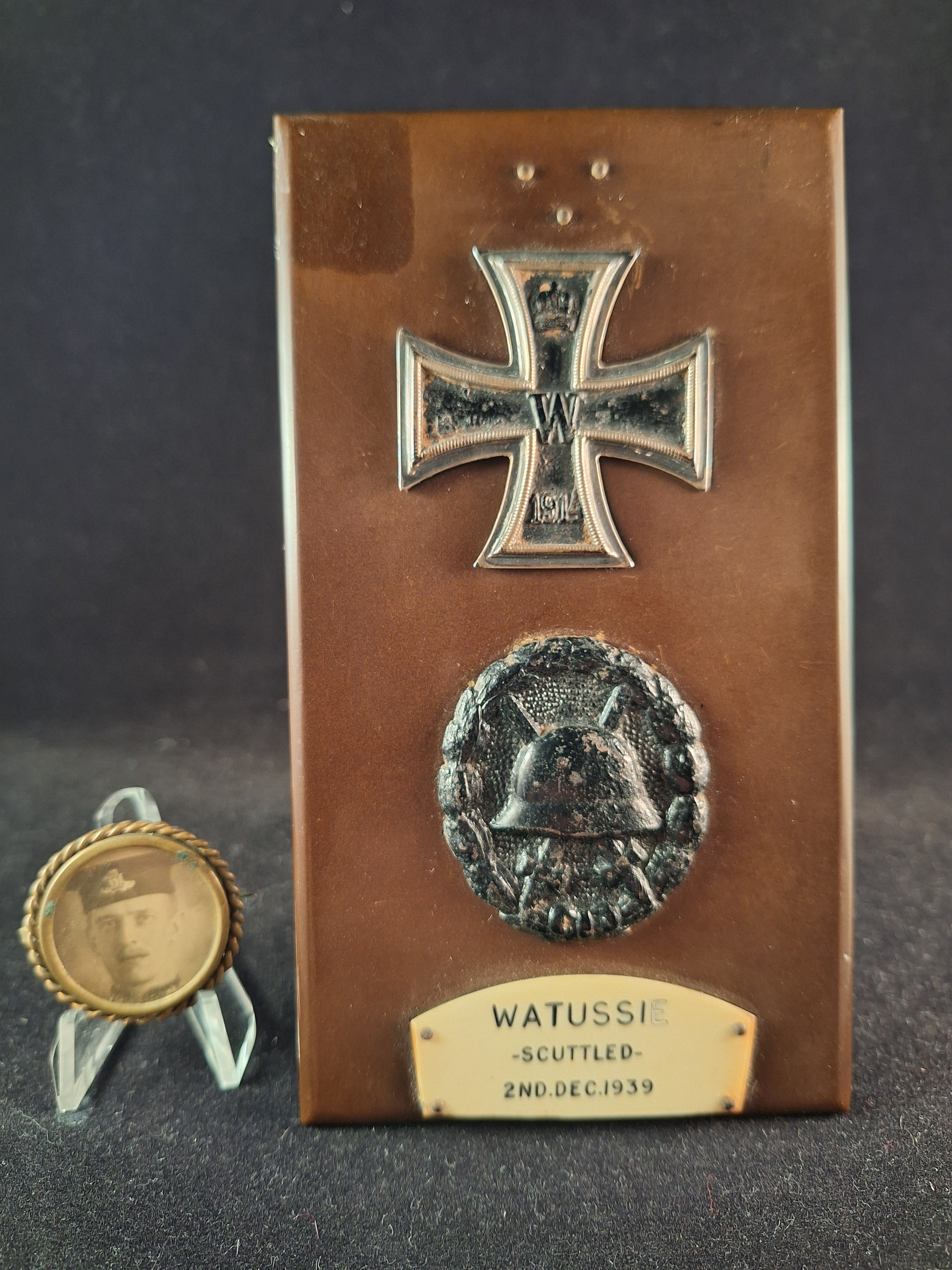 EK I fabricada en tres piezas. Magnética. Marca de fabricante "K.O.". Peso: 16'64grs. Medidas: 43'5 x 43'5. Placa de Herido en negro. Magnética. Mantiene en su integridad el baño en negro. Ligera corrosión. Peso: 9'10grs. medidas: 44 x 39. Piezas encastadas en base de baquelita con soporte posterior y marco de marfil "Watussi-Scuttled- 2nd Dec. 1939" (Afrika Linie/Woermann Linie).