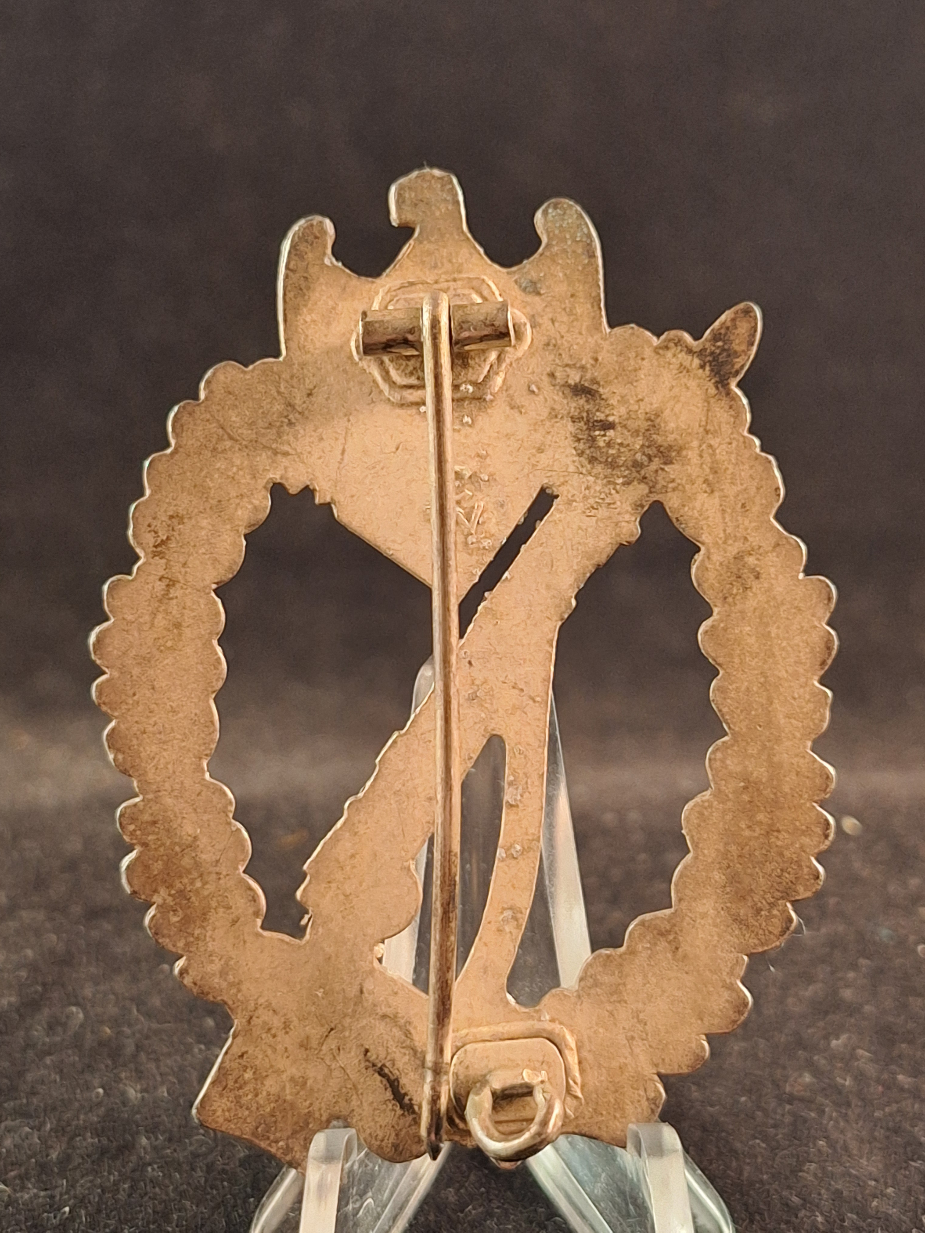 Placa de Asalto de Infantería (infanteriesturmabzeichen), maciza. Tomka plateado. Marca de fabricante "C.W" (Carl Wild). Peso: 26'94grs. Medidas: 63mm x 47mm.