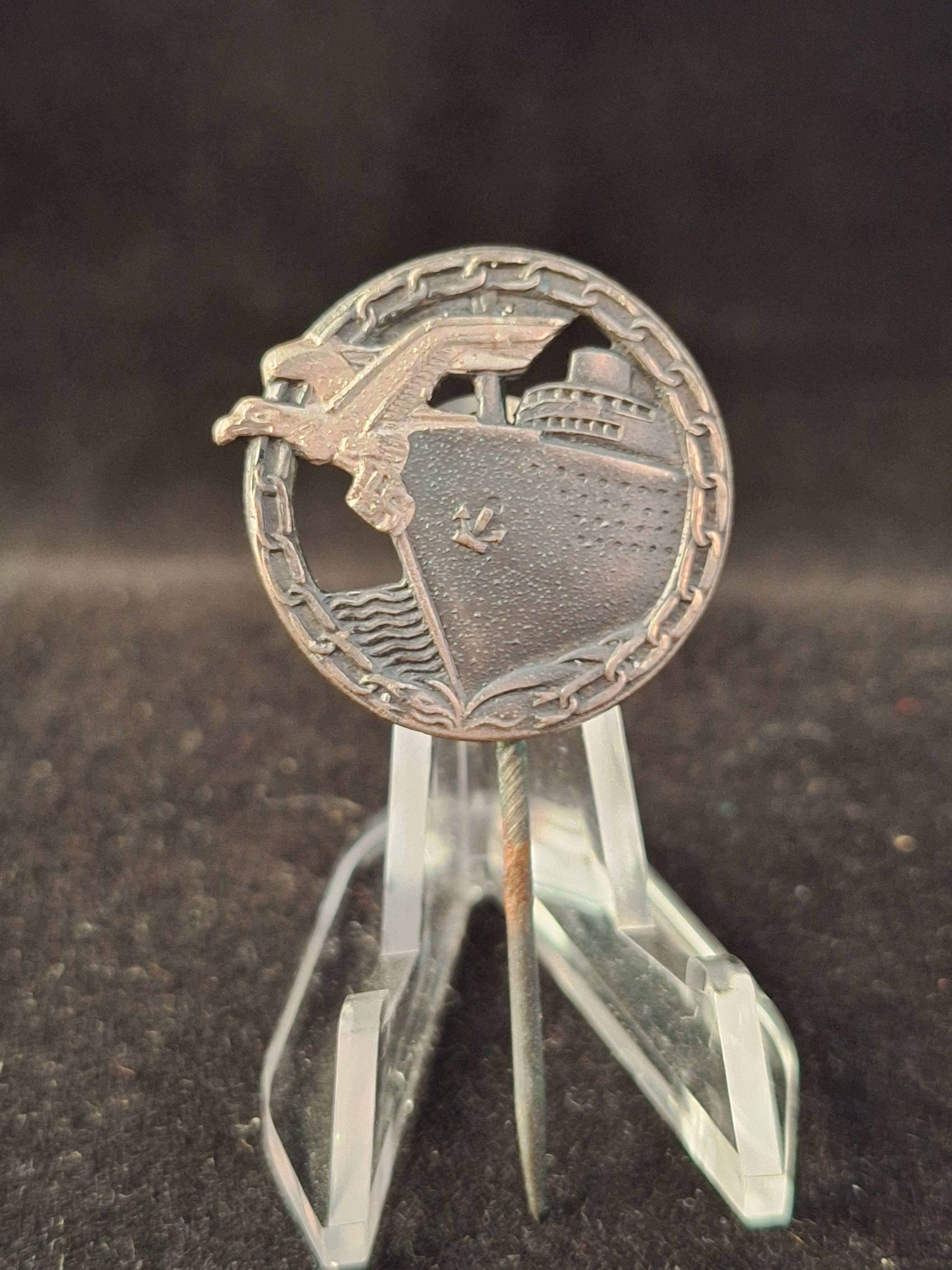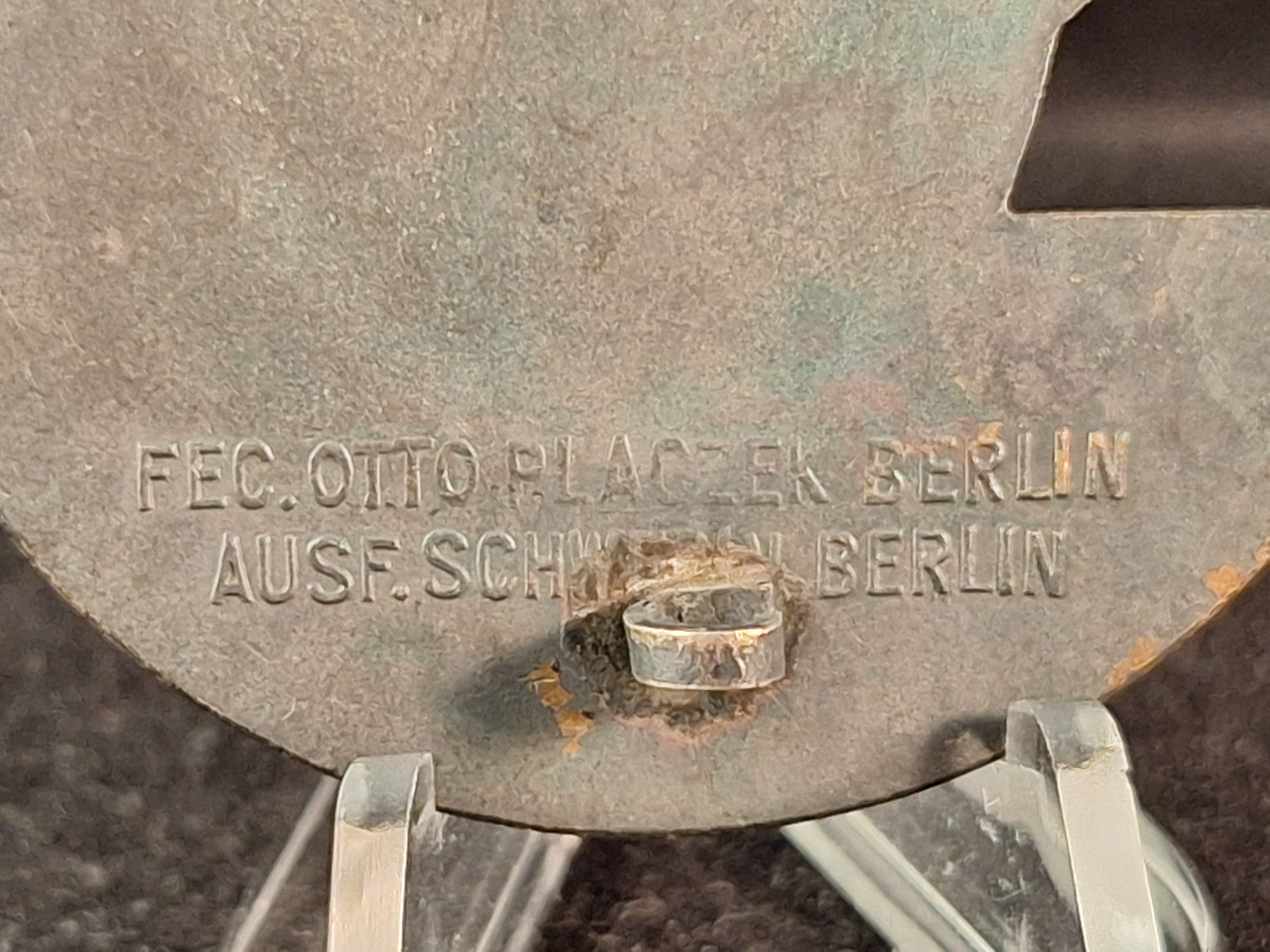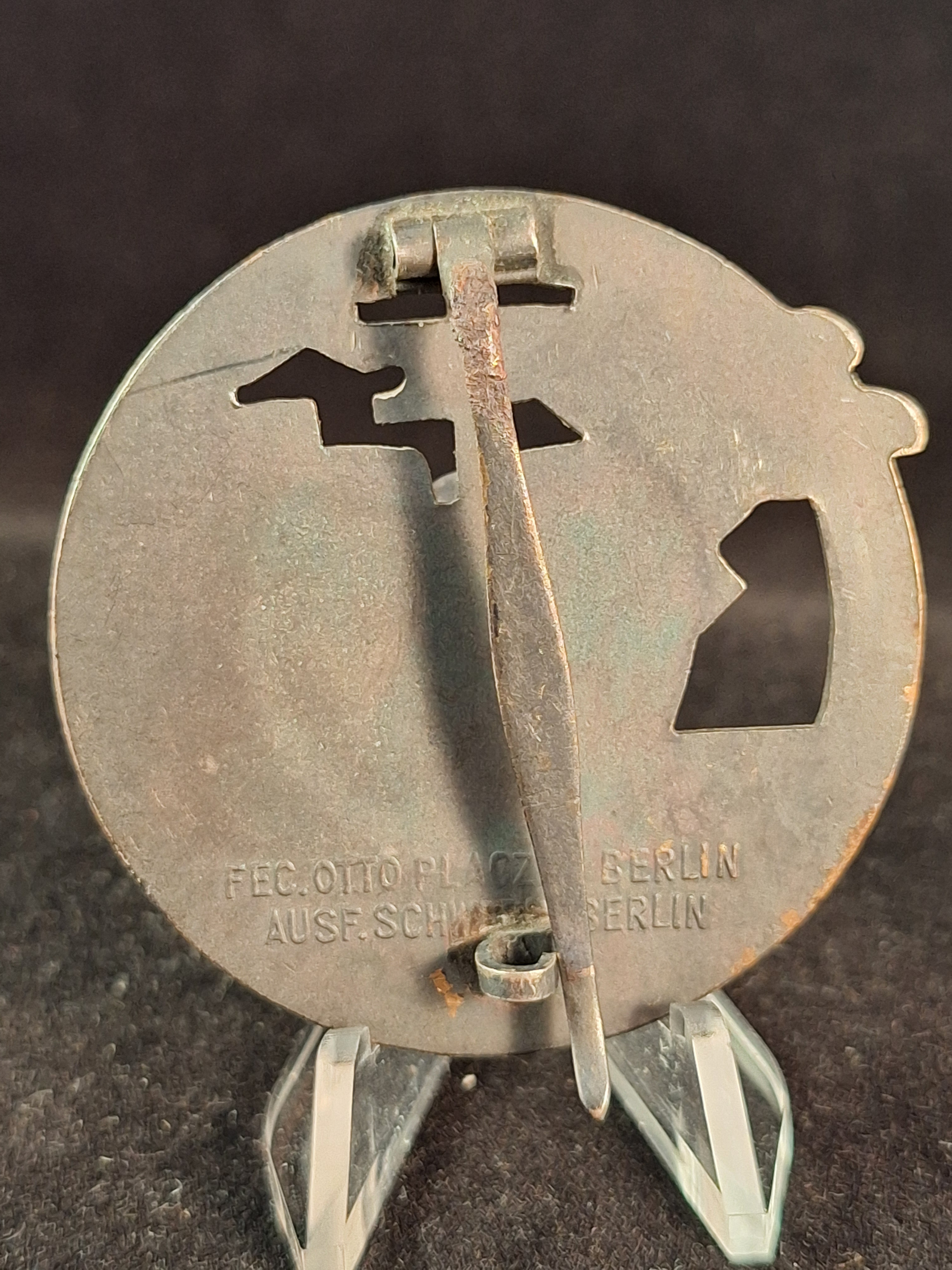 Placa de Desbloqueadores de la Kriegsmarine. Realizada en tombak plateado con una bonita patina. El águila mantiene todo su baño plateado, así como la cadena, a modo de orla. Aguja posterior vertical. Bisagra en forma de cilindro y cogida de alambre plano. Marca de fabricante "Otto Placzek, Berlin" y "Ausf.Schwerin, Berlin". * No se admiten ofertas. Peso: 31'14grs. Diámetro: 49mm. Pin en tombak y en perfecto estado. Peso: 8grs. Medidas: 54mm (aguja incluida). Diámetro: 26mm.