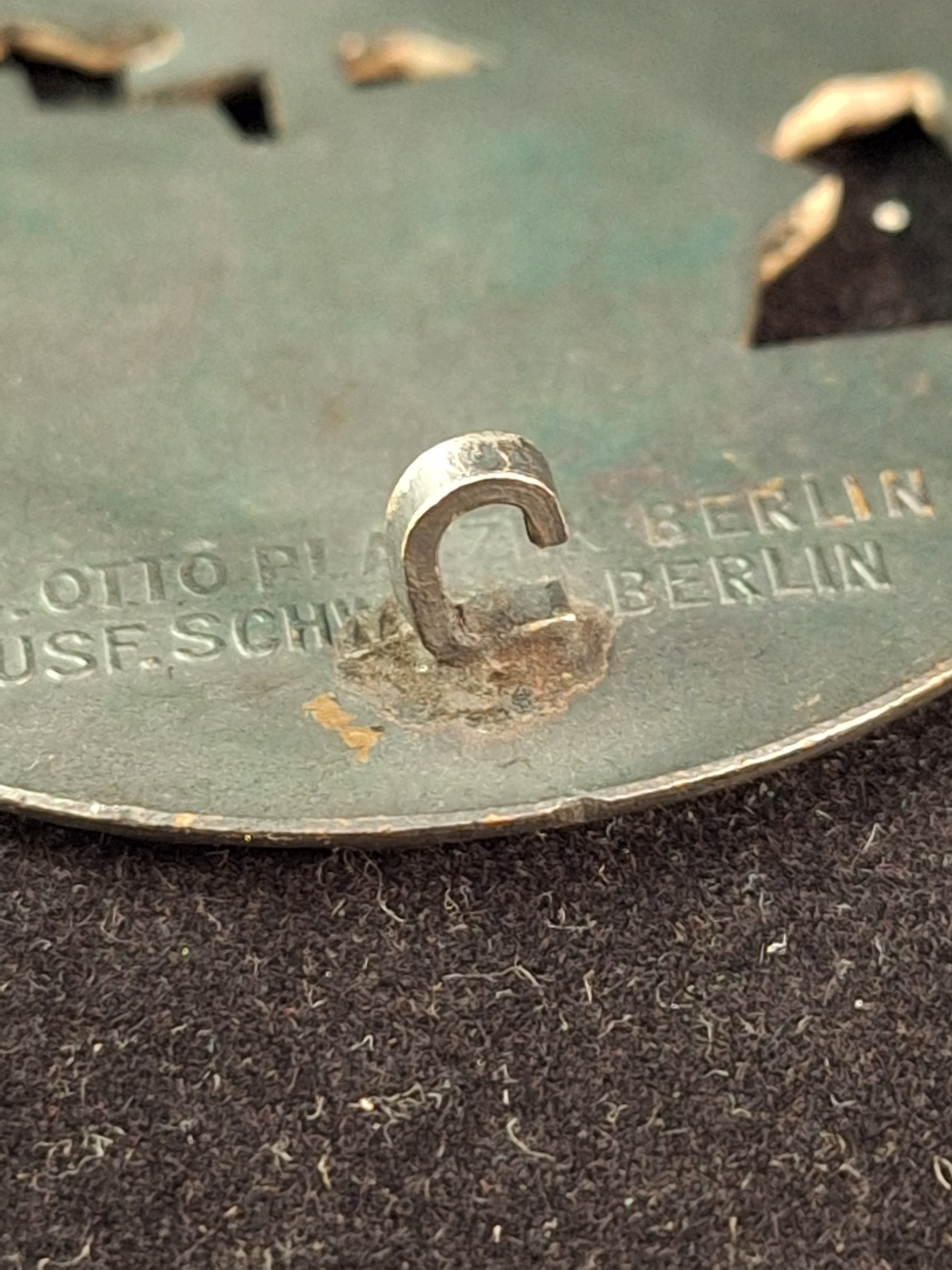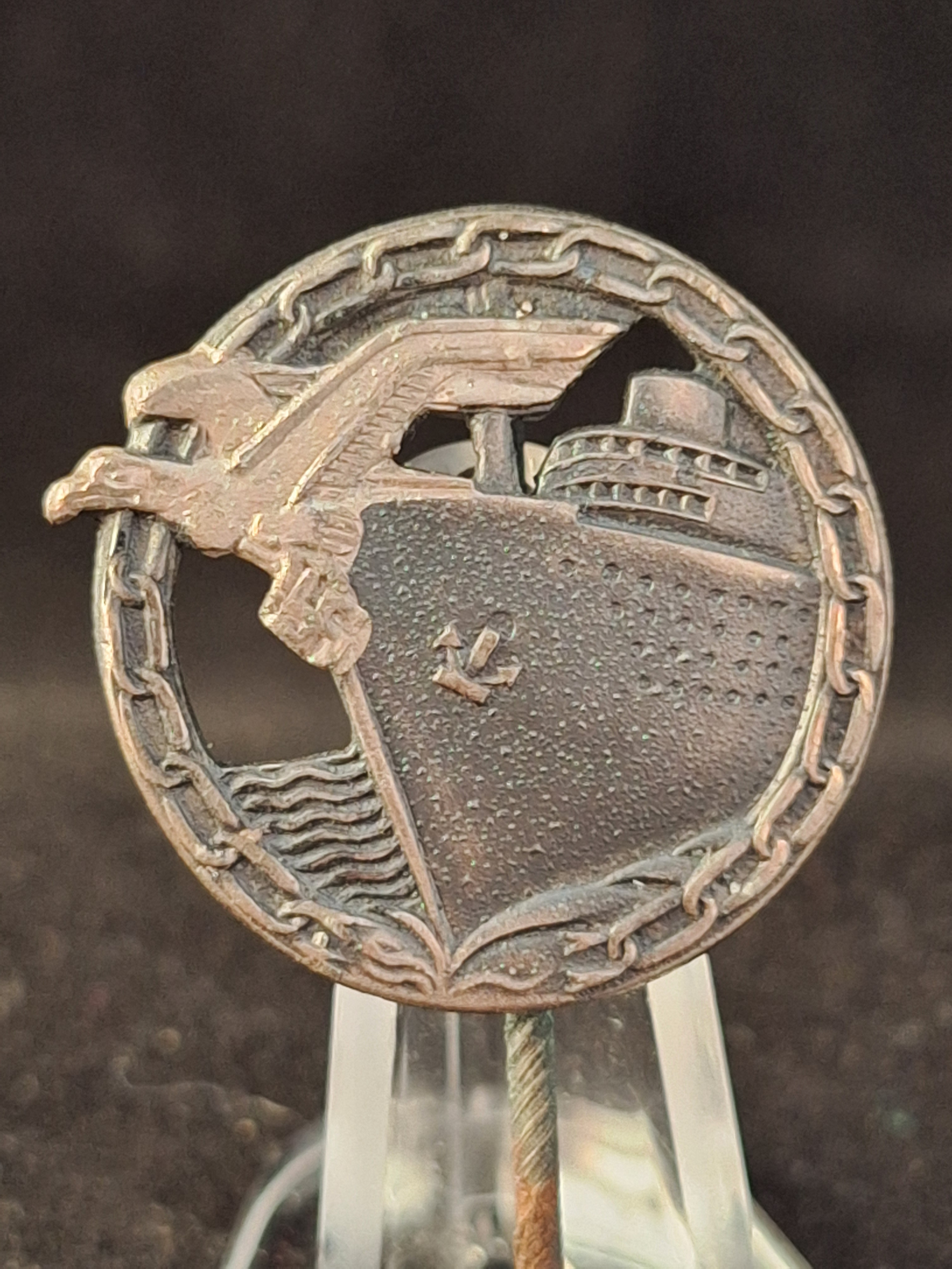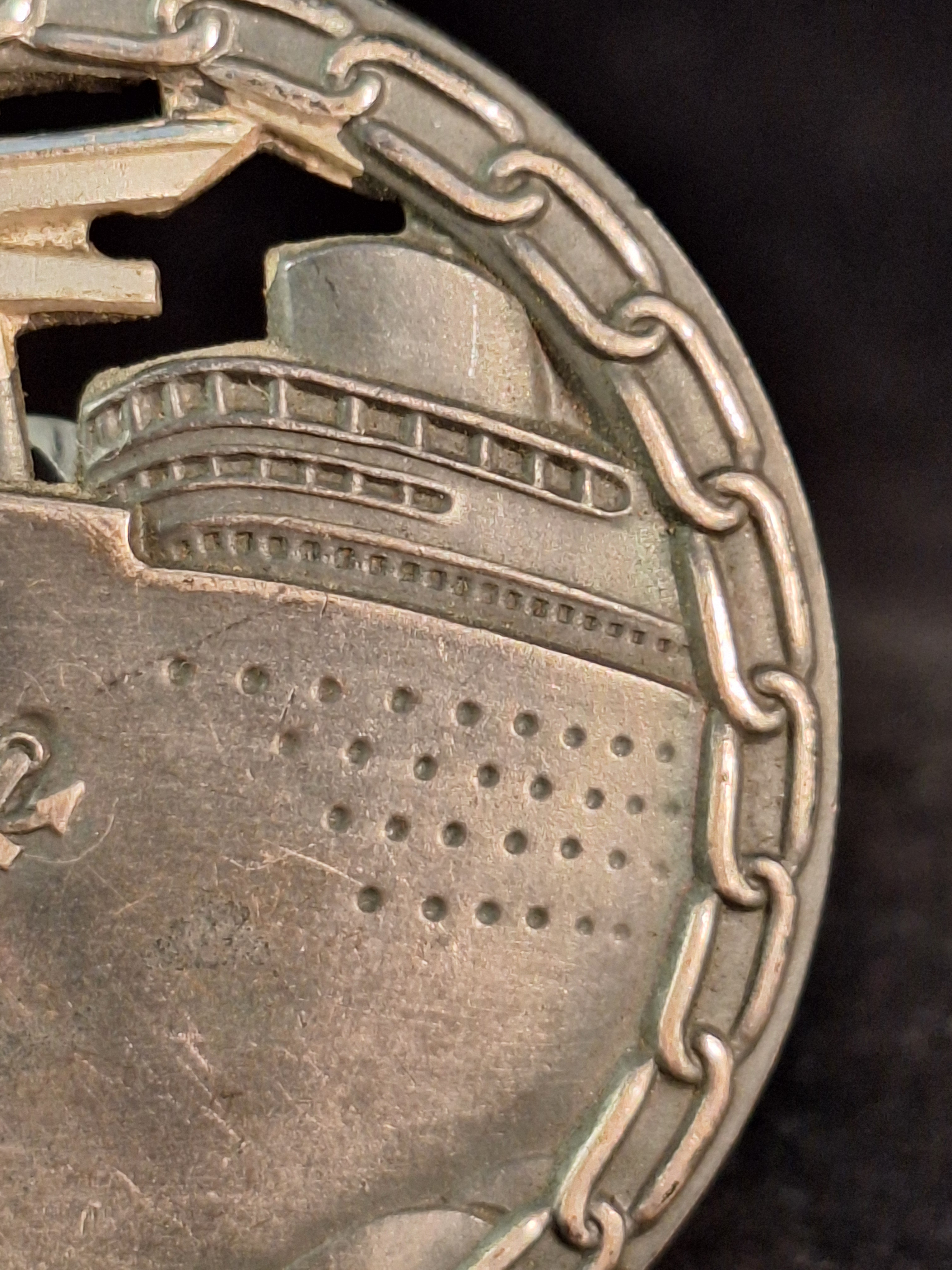 Placa de Desbloqueadores de la Kriegsmarine. Realizada en tombak plateado con una bonita patina. El águila mantiene todo su baño plateado, así como la cadena, a modo de orla. Aguja posterior vertical. Bisagra en forma de cilindro y cogida de alambre plano. Marca de fabricante "Otto Placzek, Berlin" y "Ausf.Schwerin, Berlin". * No se admiten ofertas. Peso: 31'14grs. Diámetro: 49mm. Pin en tombak y en perfecto estado. Peso: 8grs. Medidas: 54mm (aguja incluida). Diámetro: 26mm.