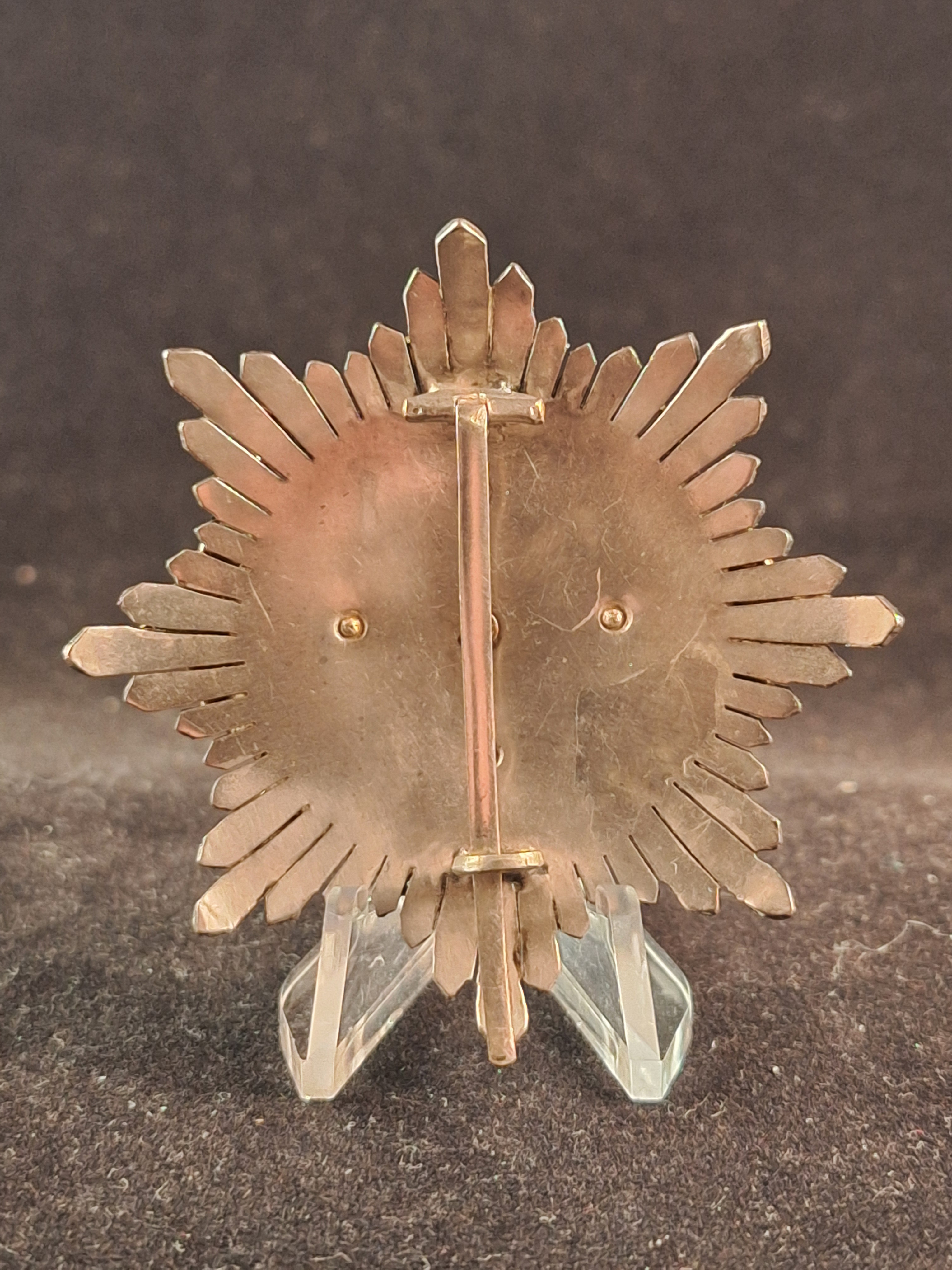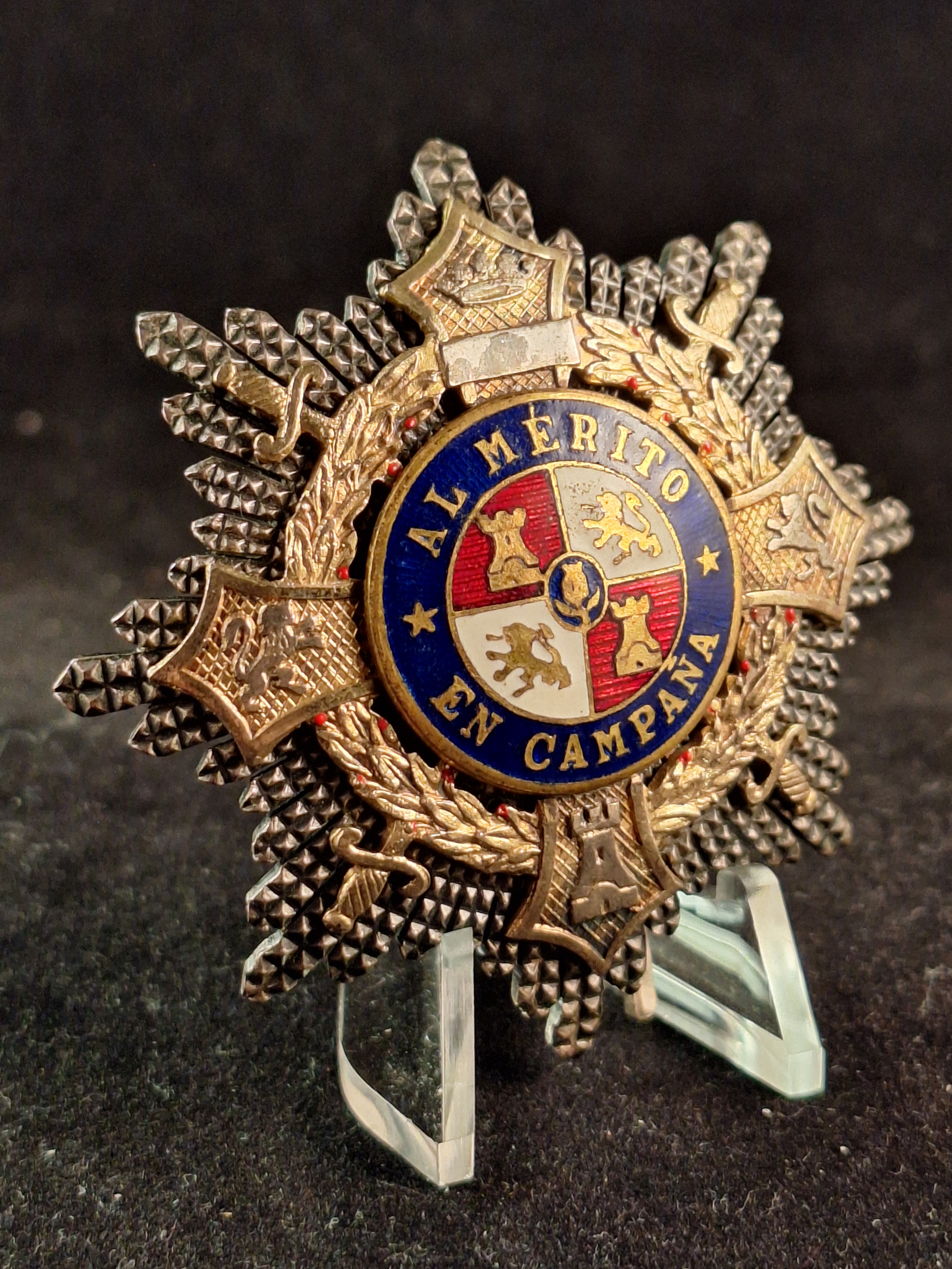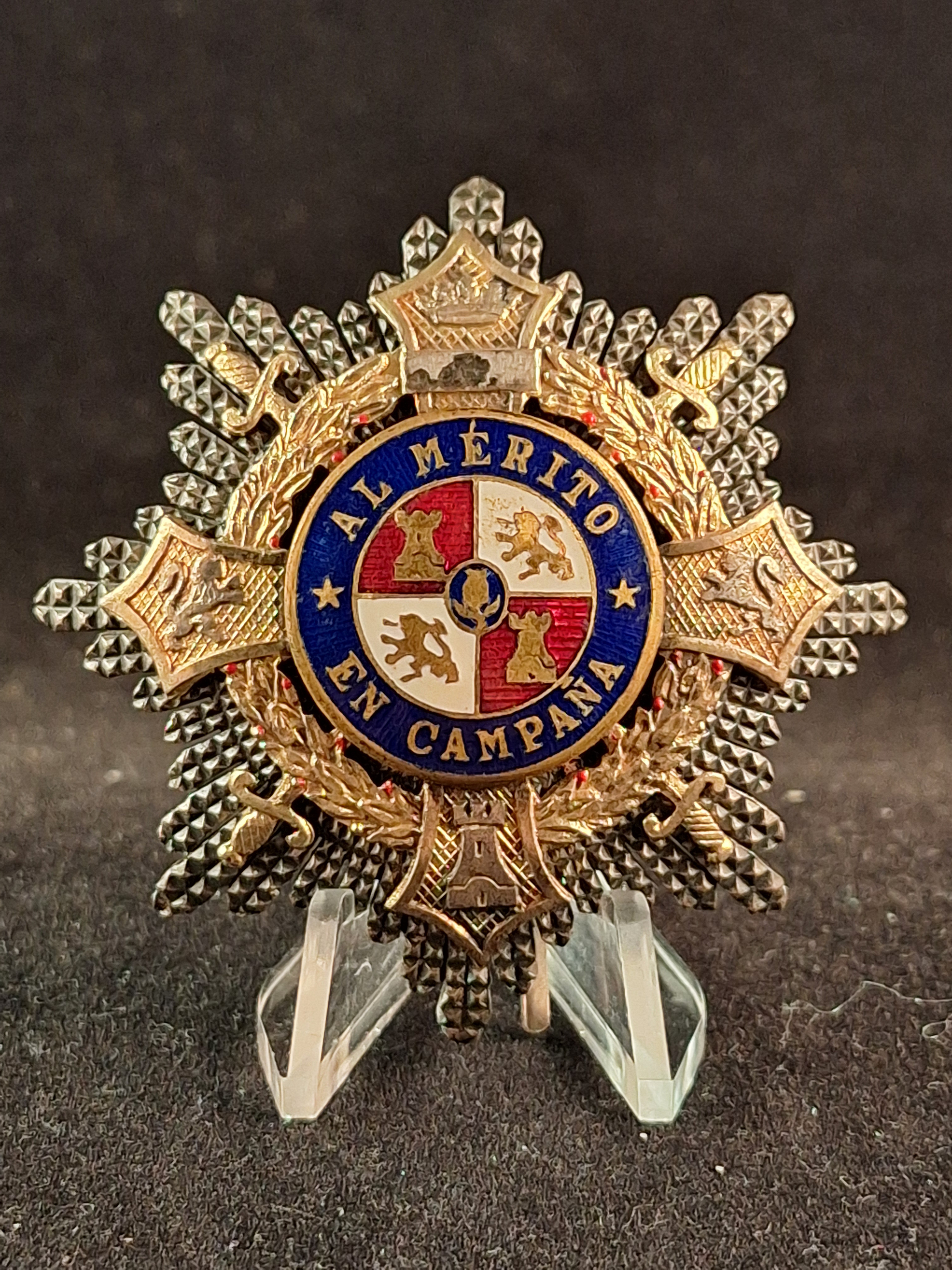 Cruz con ráfagas en plata con laureles, espadas y corona imperial en oro. En sus brazos, castillos y leones. Centro circular esmaltado en rojo y blanco. Muy buen estado. Cruz típica de Egaña, que fabricó entre los años 38-42. Las cruces entregadas a la Legión Cóndor eran de fabricación Meybauer; no se descarta que también se entregasen piezas de Egaña. Peso: 39'53grs. Diámetro: 60mm.