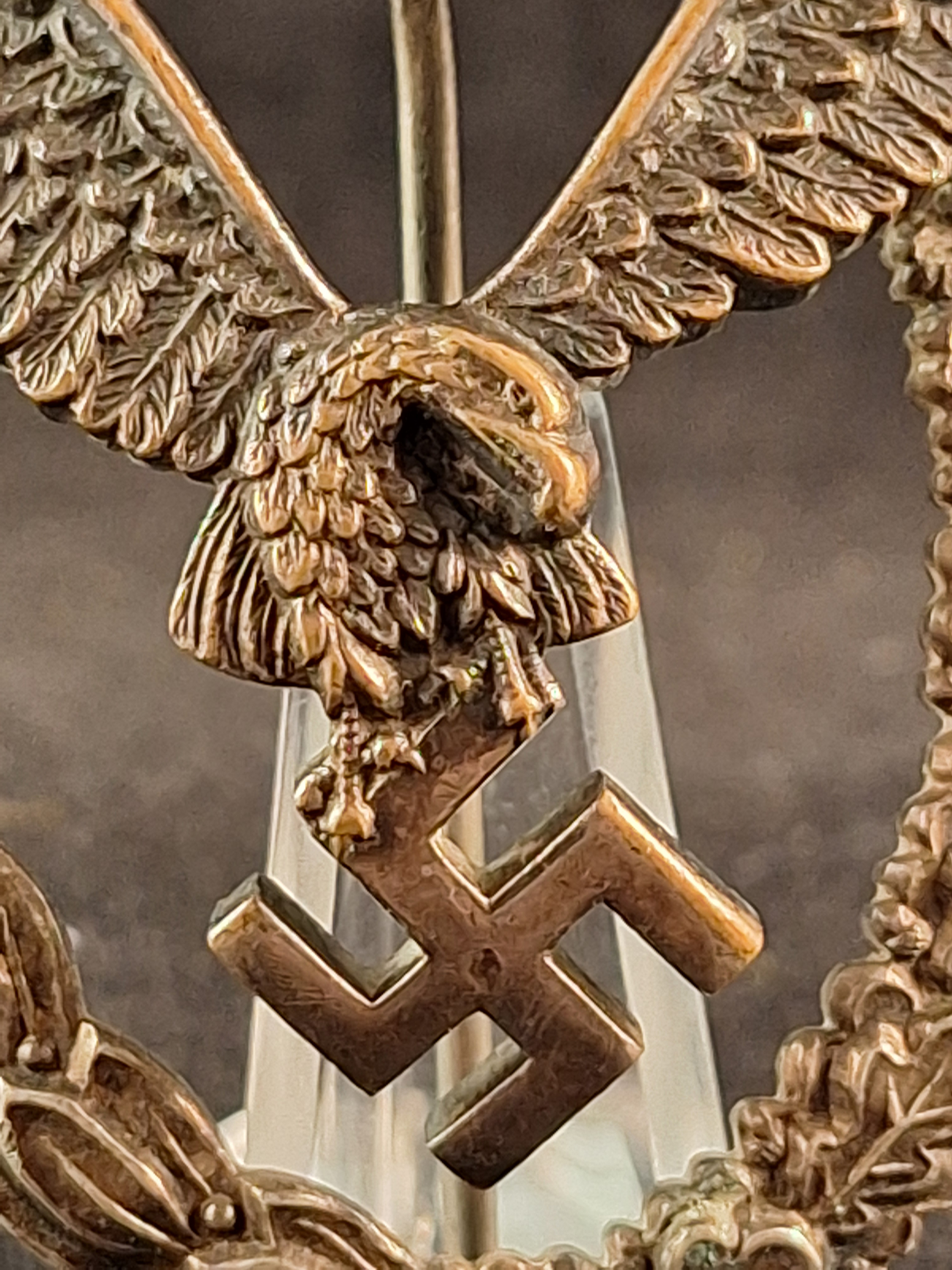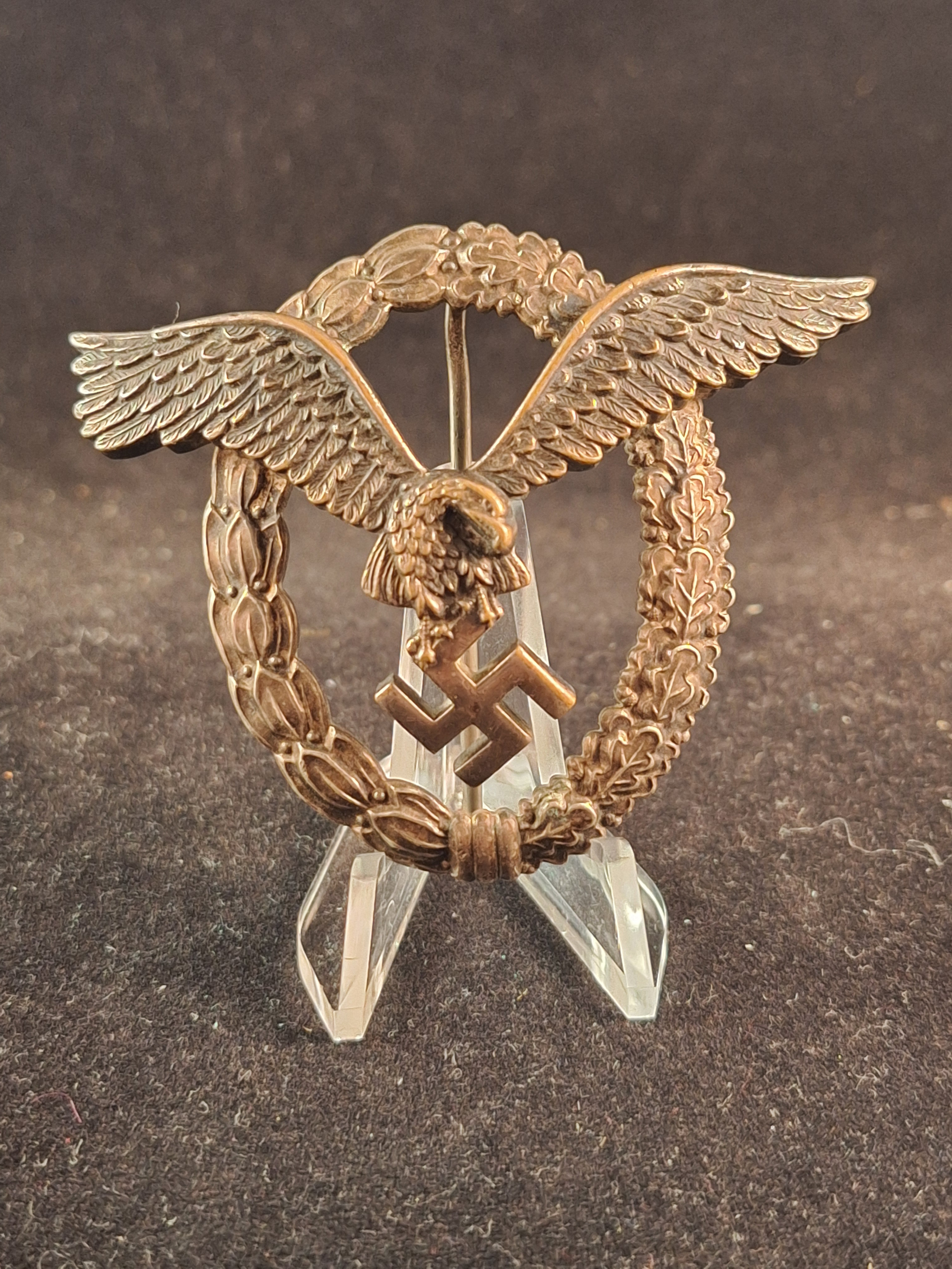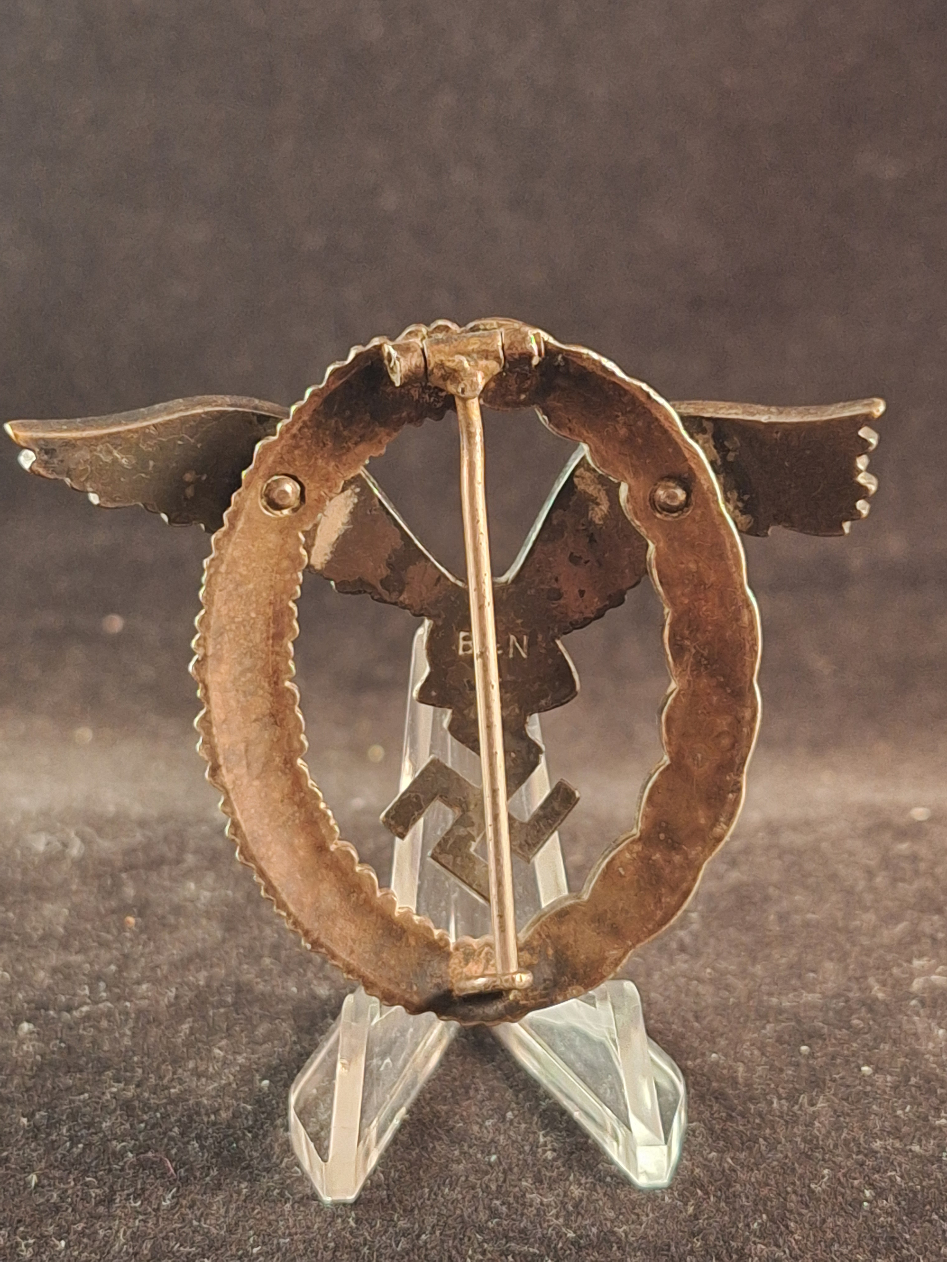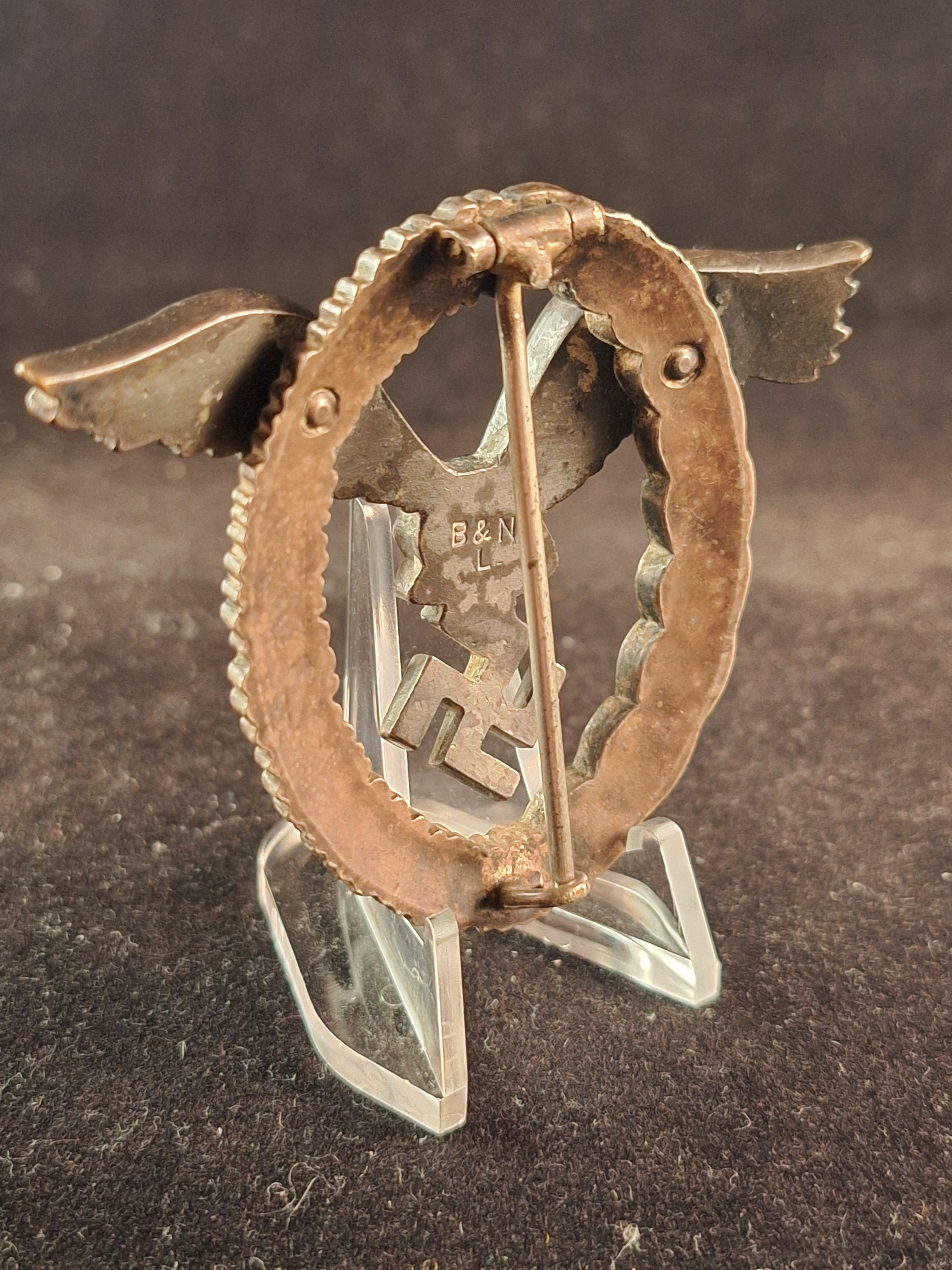 Placa de Piloto de la Luftwaffe. Tombac. Águila ennegrecida. Conjunto con bonita patina oscurecida. Reverso con aguja vertical y marca de fabricante "B&NL" (Berg & Nolte, Lüdenscheid). Buen estado. Usada. Peso: 46'84grs. Medidas. 54mm x 65mm.