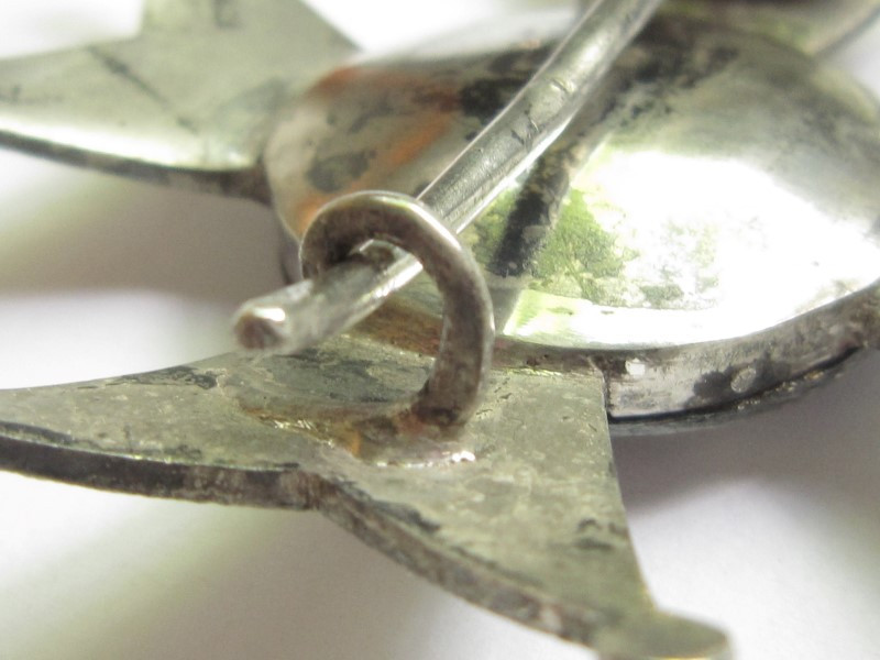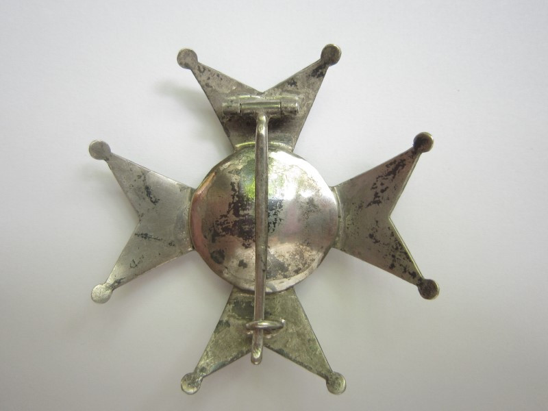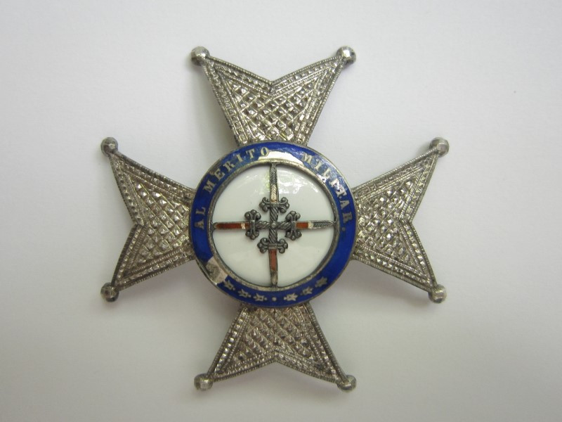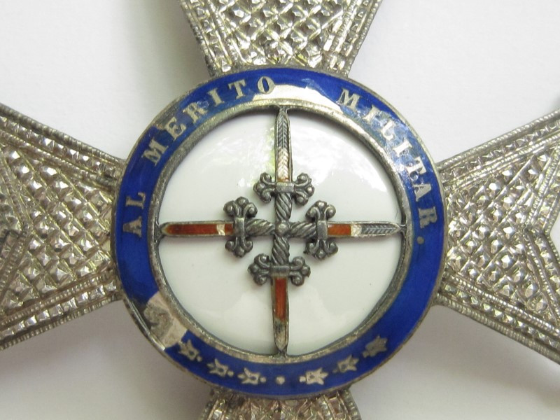 Placa de Primera Clase de la Real y Militar Orden de San Fernando. Cruz de cuatro brazos abrillantados en plata. Centro circular, sobre fondo esmaltado en blanco, cruz formada por cuatro espadas esmaltadas en rojo (ligera pérdida de esmalte). Orlando el conjunto sobre esmalte azul (ligera pérdida) la inscripción "Al Mérito Militar". Reverso liso.