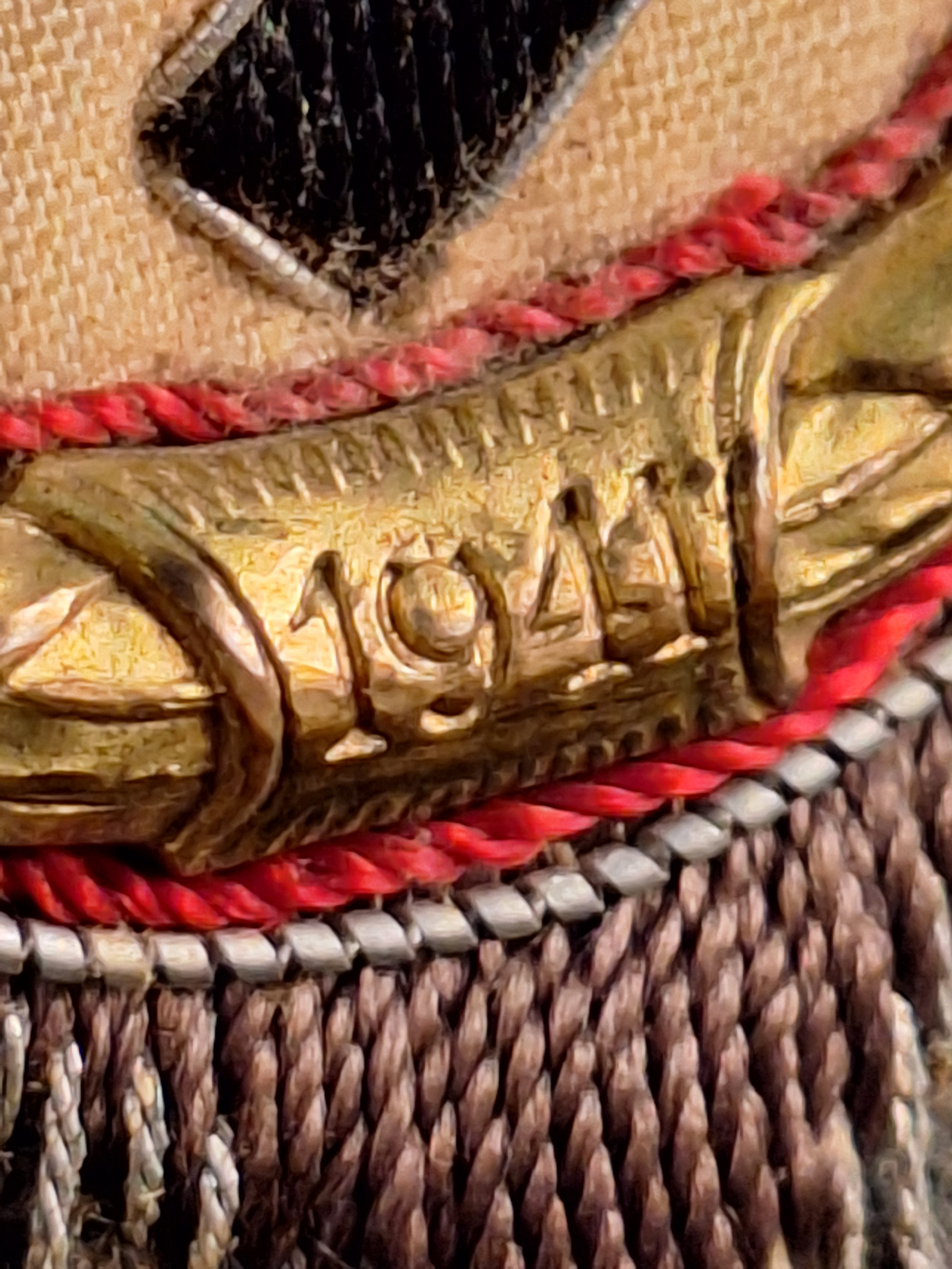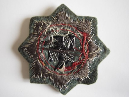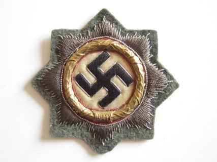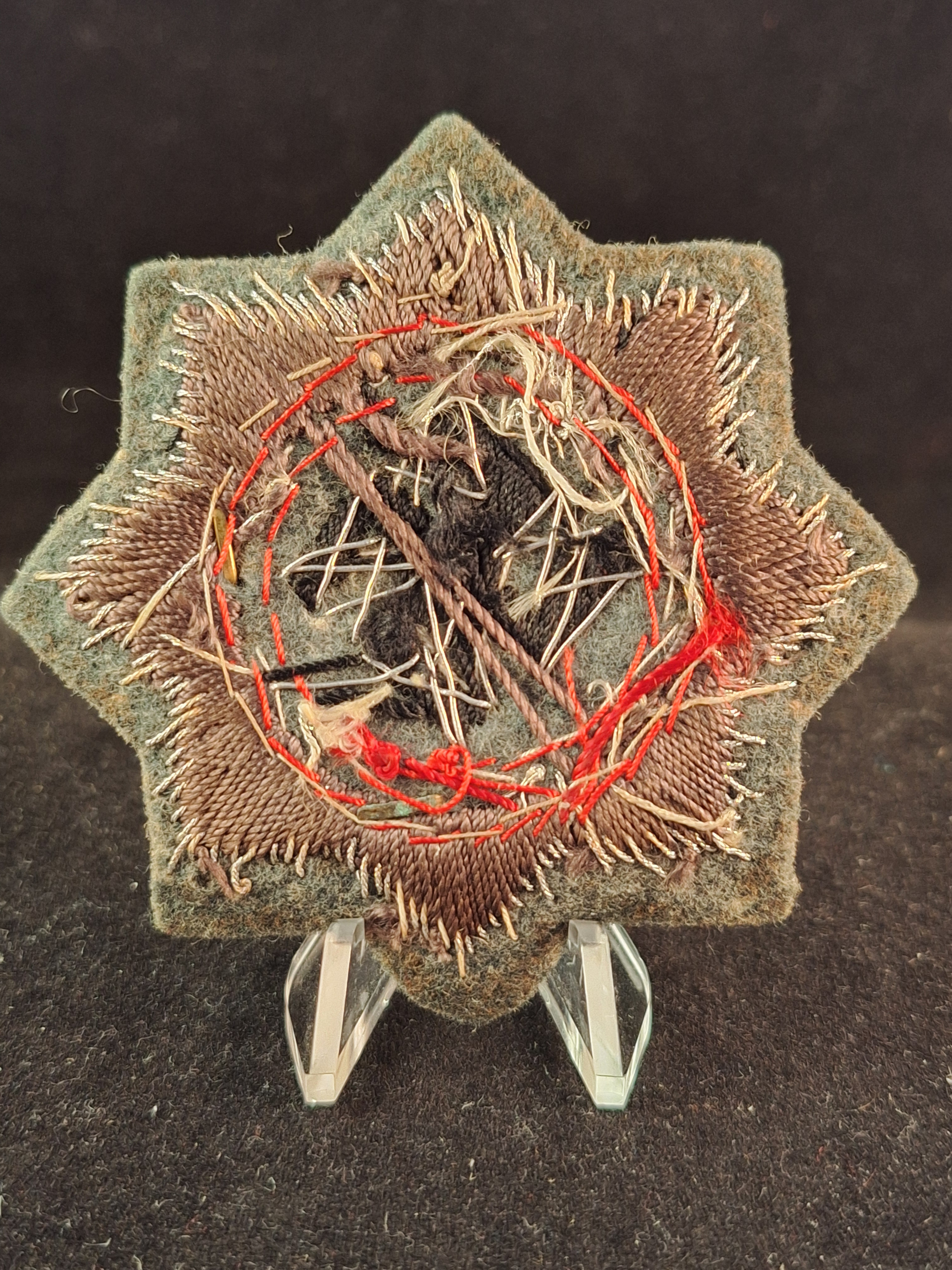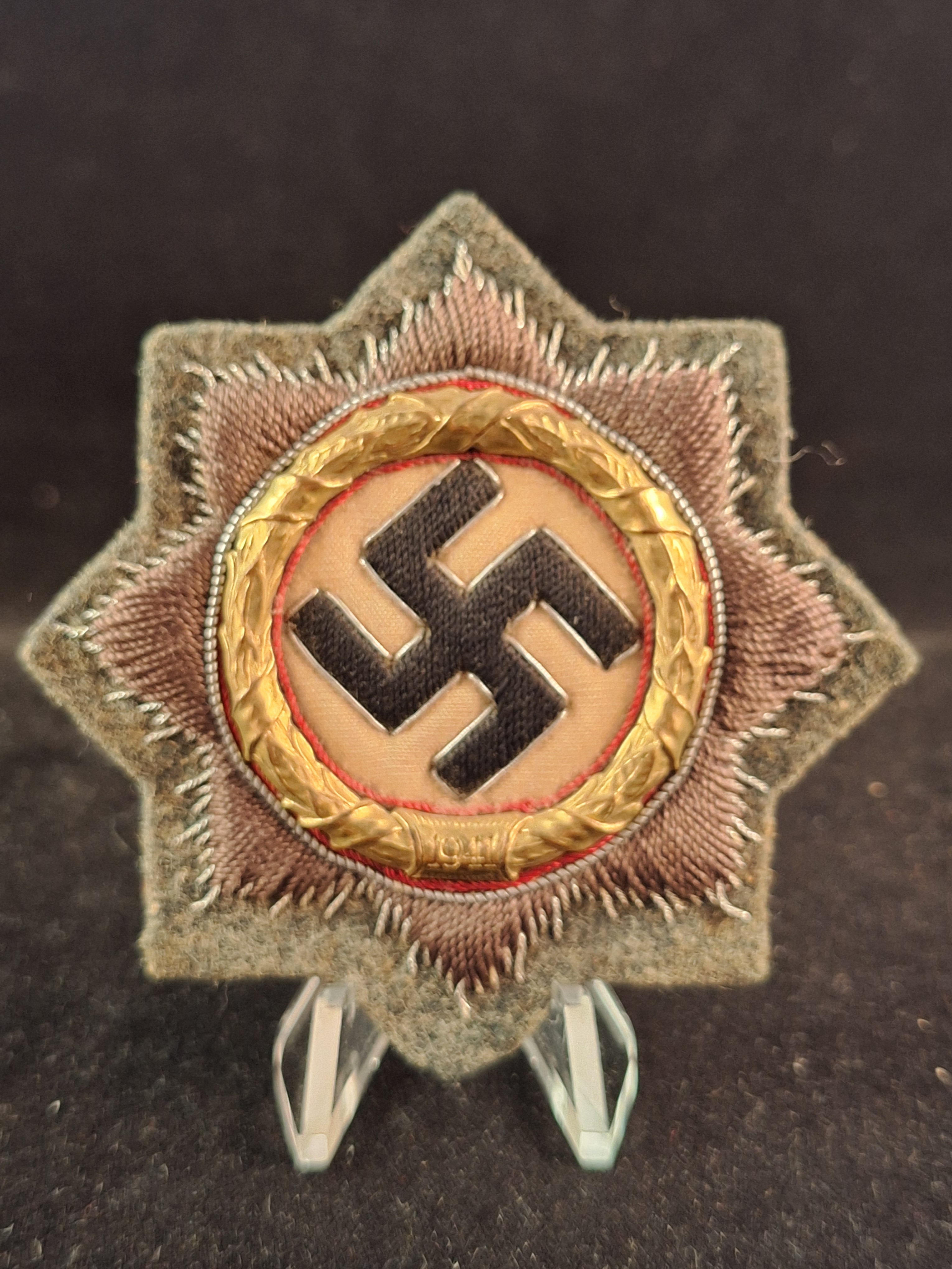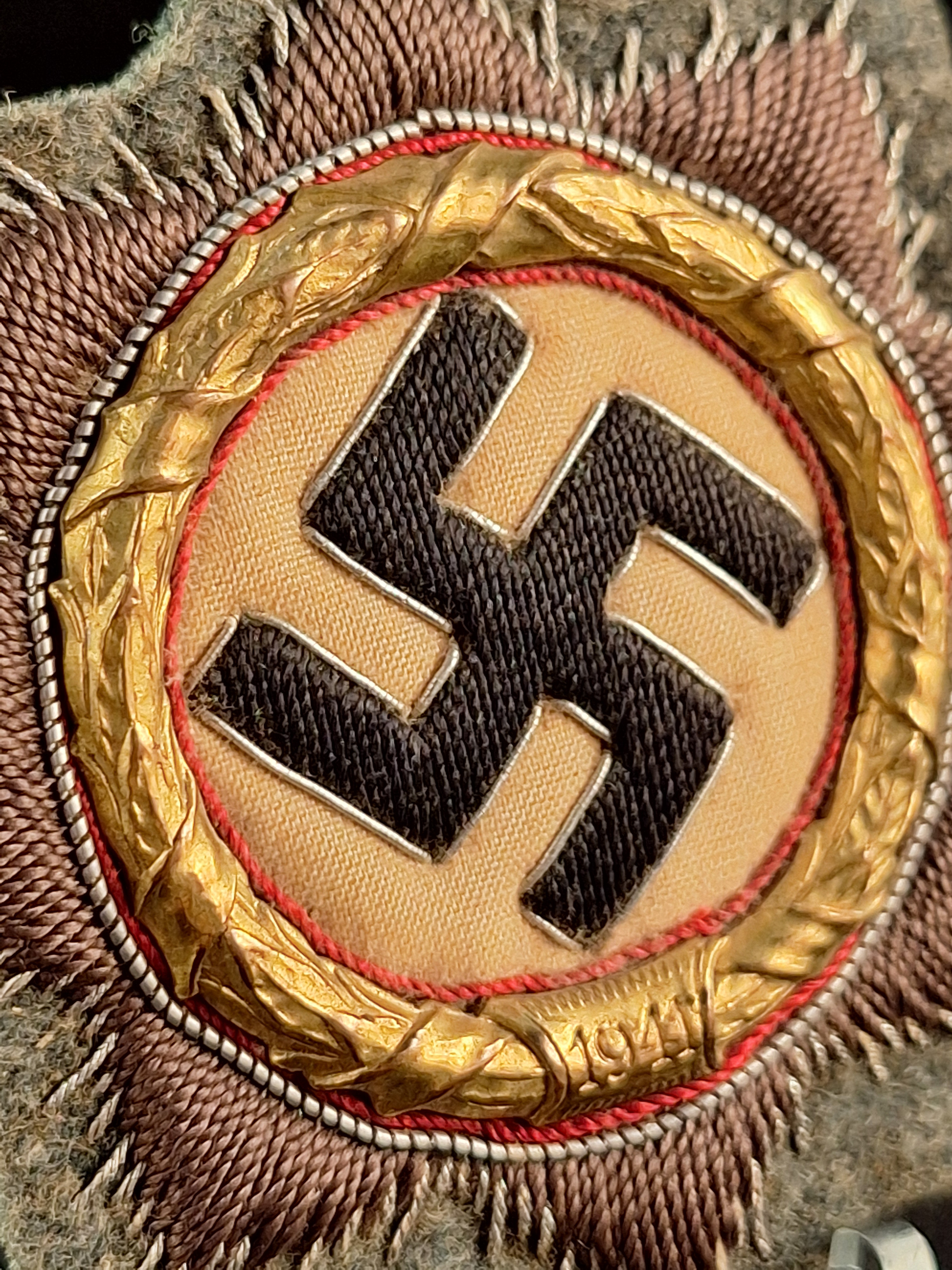 Cruz alemana en oro. Tela. Centro circular con corona dorada del fabricante Juncker (defecto en la parte superior del 9). Trece muescas en la fecha de creación de la condecoración (1941). Pieza de algodón verde-feldgrau recortada y sobre ella, pieza circular de rayón blanco sobre la que se superpone una svástica de cartón prensado y recubierta de algodón negro. Reverso descubierto. Buen estado.