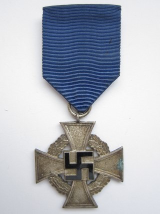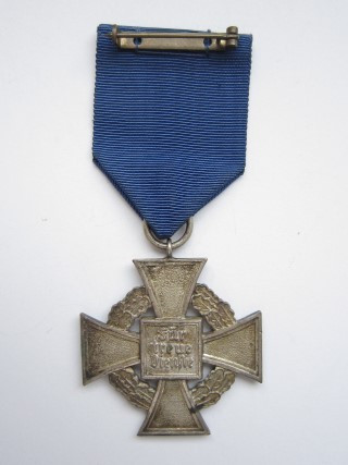 Medalla de 25 años de Servicio Leal al estado. No magnética. Bronce plateado. Fabricada en una pieza. Esmaltes negros en muy buen estado. Cinta original con aguja posterior horizontal.