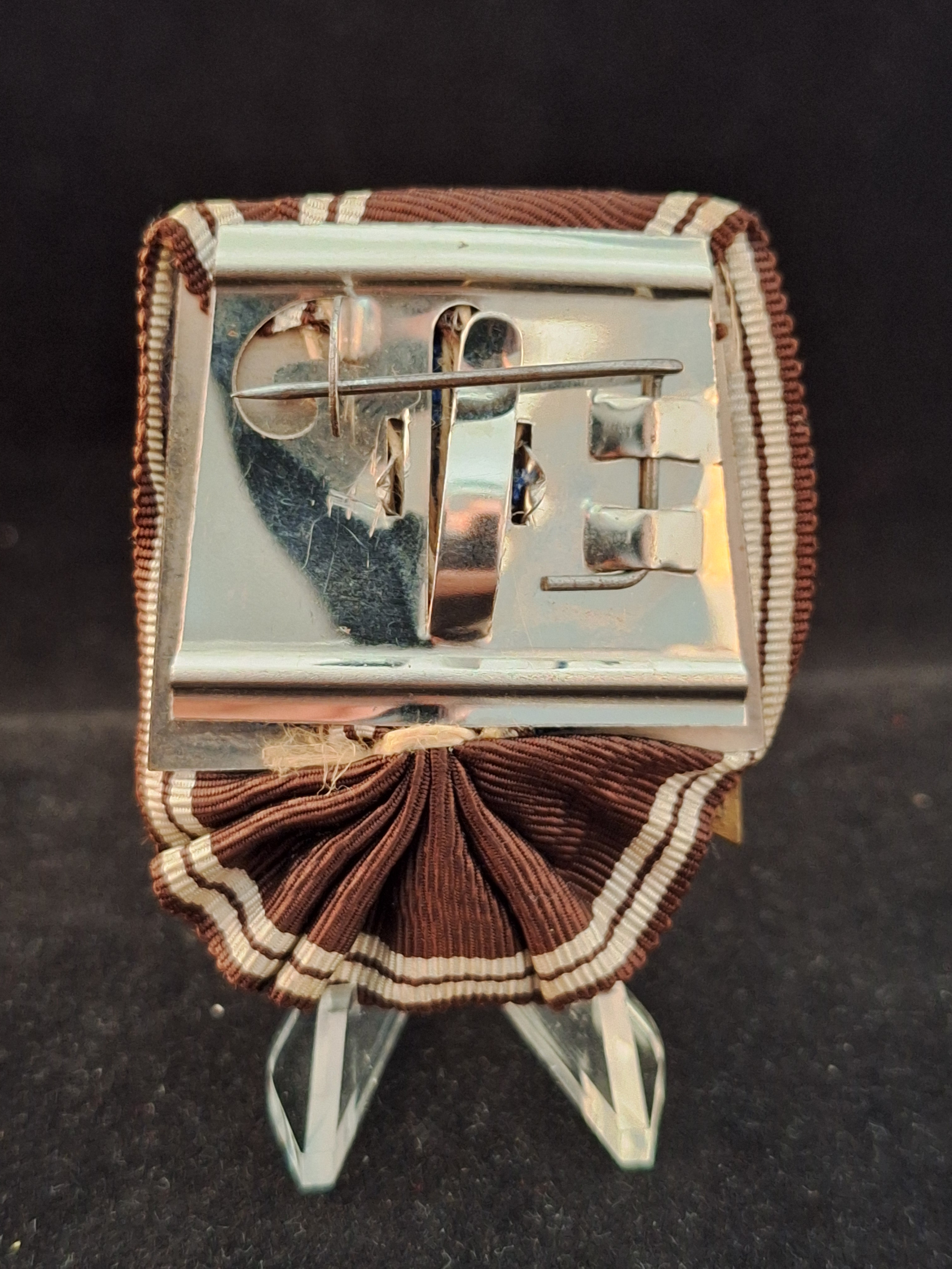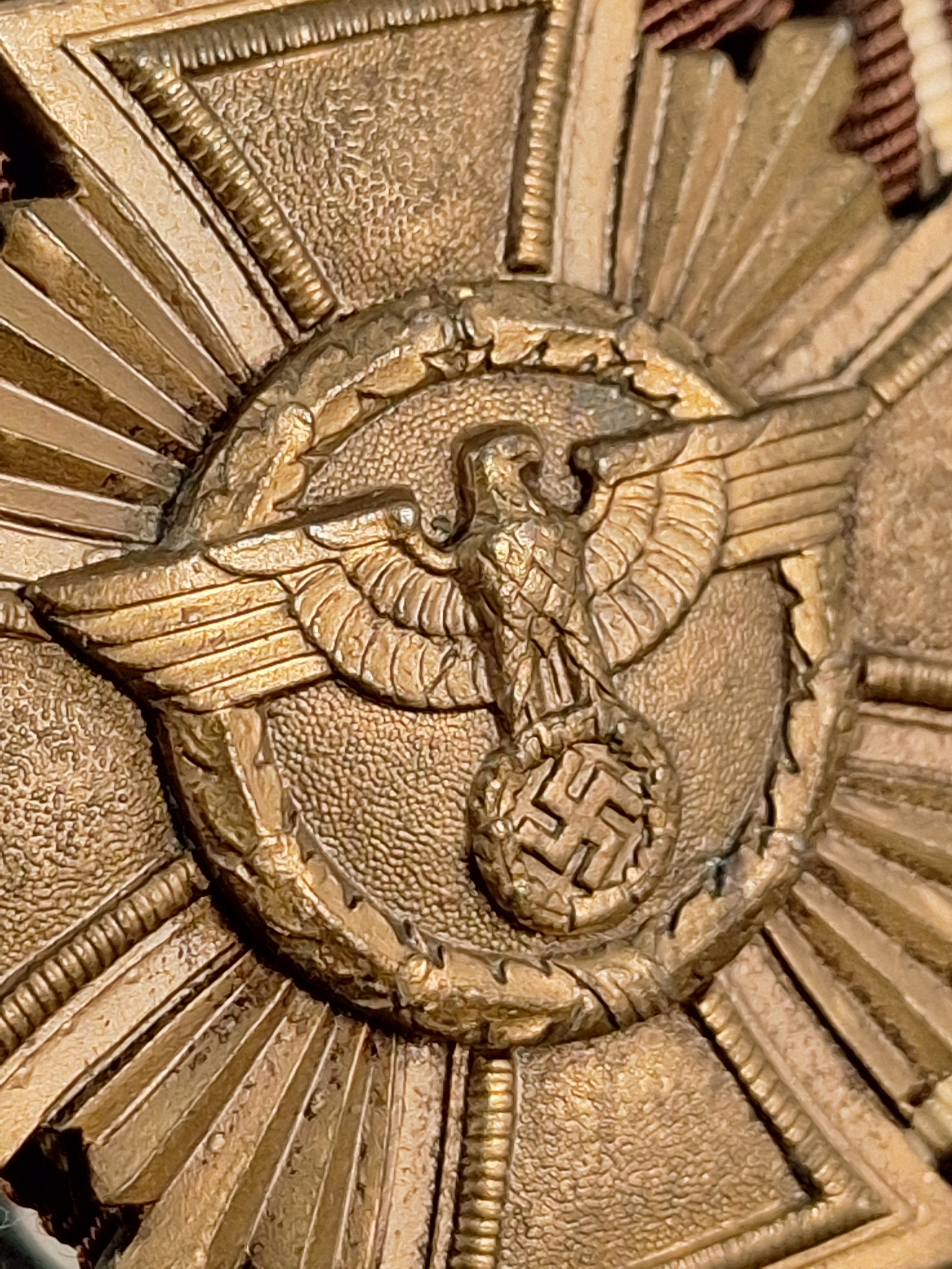 Medalla del NSDAP por 10 años de Servicio al partido. Aluminio bañado en bronce. Versión pesada. Montada en pasador de gala con cinta original marrón y listas laterales blancas. Peso: 51'71grs. Medidas (medalla): 43'5mm x 43'5mm.